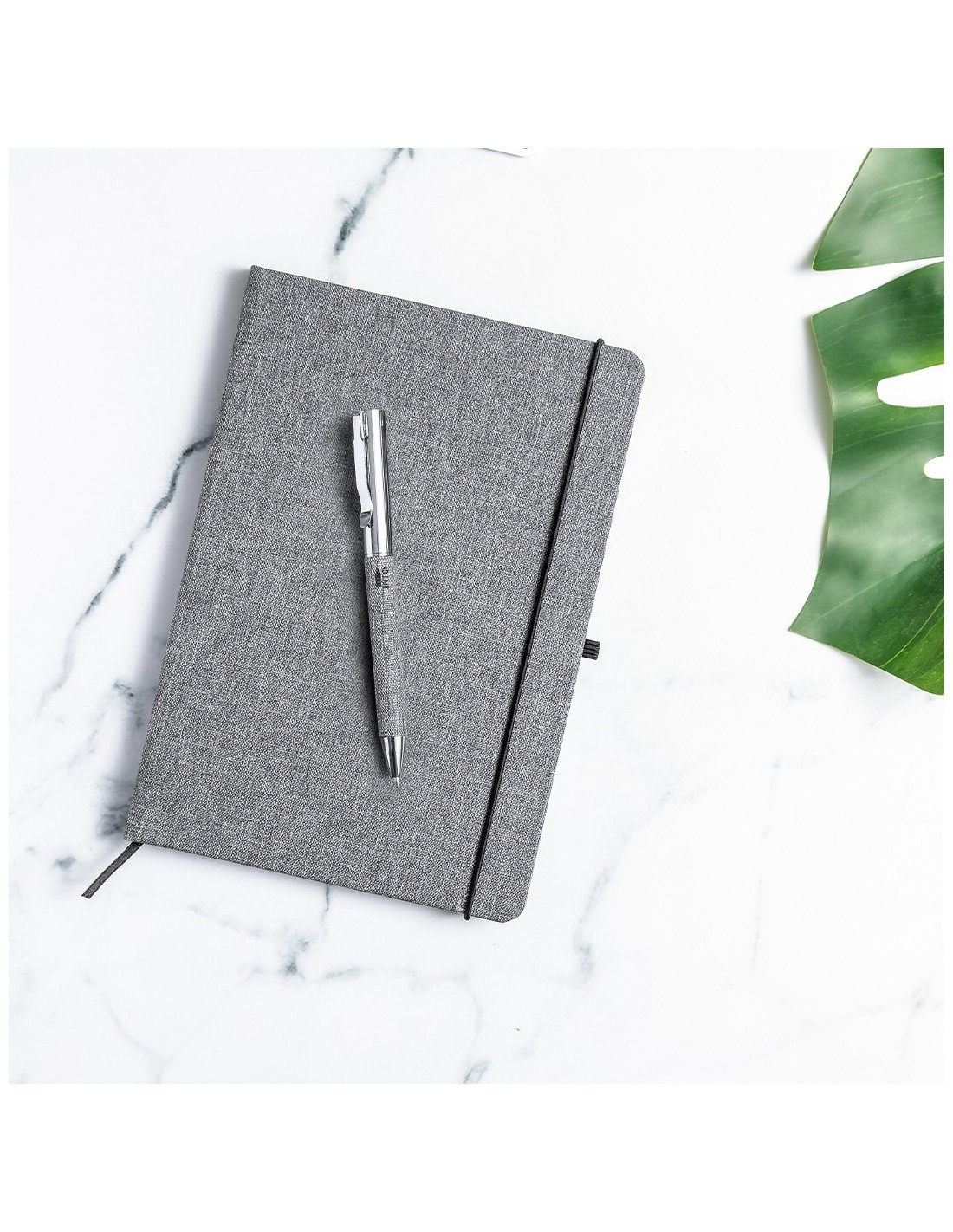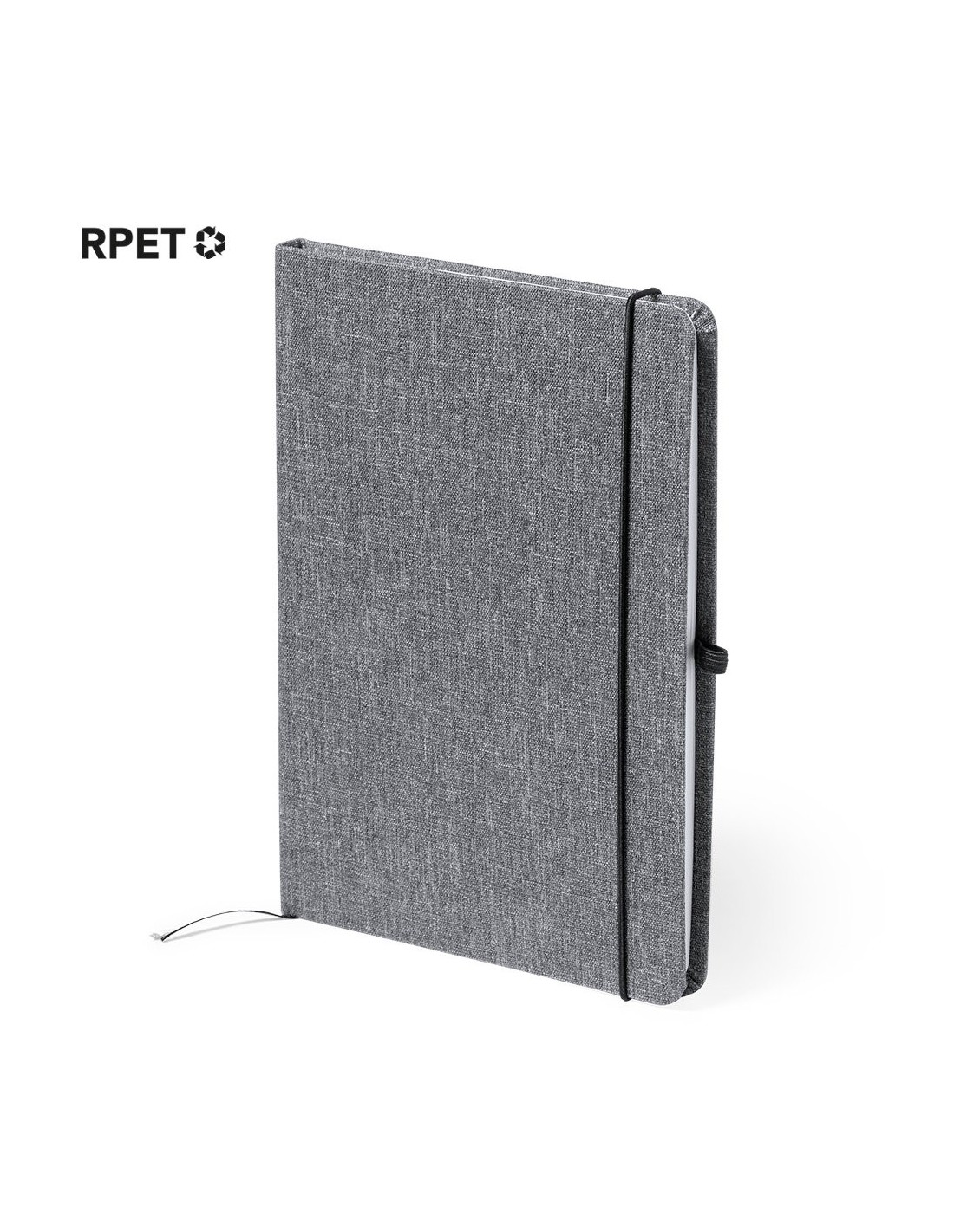Bloc de notas de línea nature. Con tapas rígidas fabricadas en RPET, elaborado a partir de plástico reciclado, para así fomentar la reutilización de residuos plásticos y ayudar a la sostenibilidad del planeta. Interior con 100 hojas de disposición a una raya. Incluye marcapáginas, elástico de cierre y soporte para bolígrafo a juego. incluye distintivo RPET en contraportada.