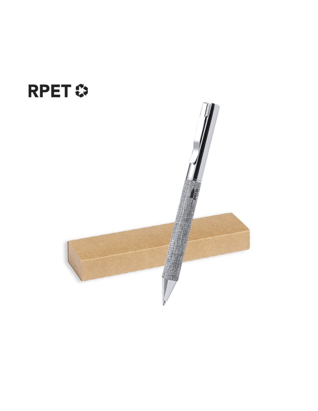 Bolígrafo fabricado en metal cromado y con cuerpo recubierto en poliéster RPET, elaborado a partir de plástico reciclado para así fomentar la reutilización de residuos plásticos y ayudar a la sostenibilidad del planeta. Elegante clip metálico y accesorios a juego, de mecanismo giratorio y en tinta azul. Con distintivo RPET en cuerpo y presentado estuche kraft con funda a juego.