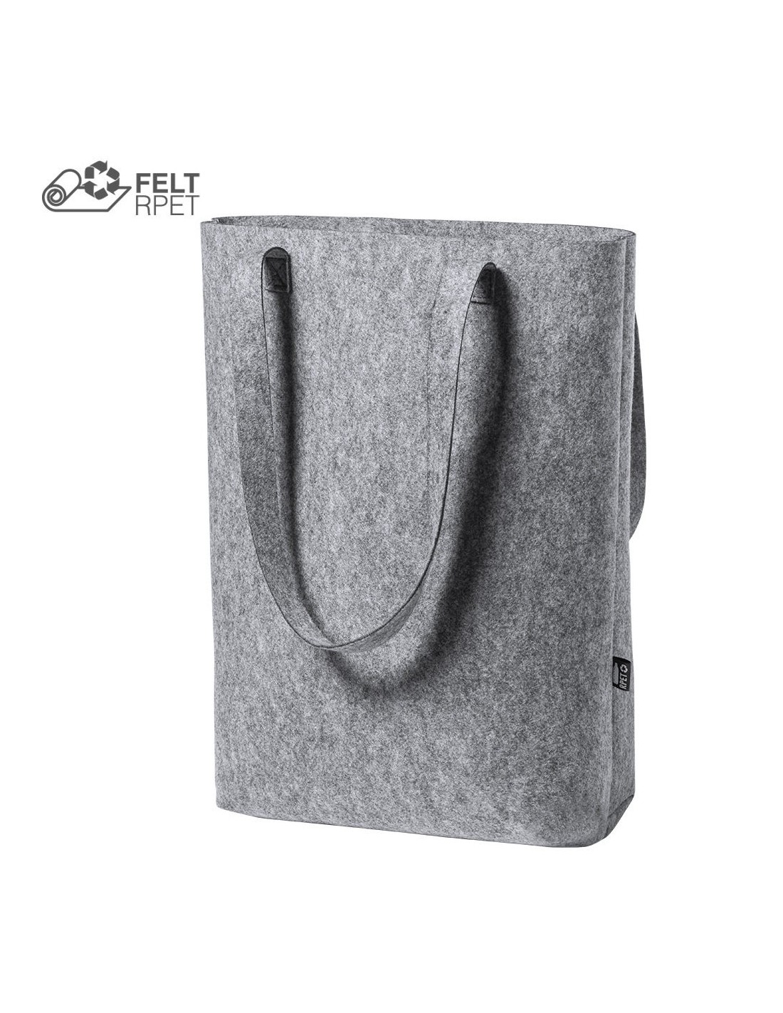 Bolsa de línea nature y en resistente fieltro RPET reciclado, fruto de la combinación del proceso de reciclaje de materiales plásticos junto con la técnica milenaria de fabricación del fieltro, dando como resultado un material de eco-tendencia que, además de ser de origen reciclado, también se convierte en reciclable. De diseño rectangular, con fuelle en la base y asas reforzadas largas (70 x 3,5 cm). Resistencia hasta 6kg, con distintivo RPET en etiqueta exterior.