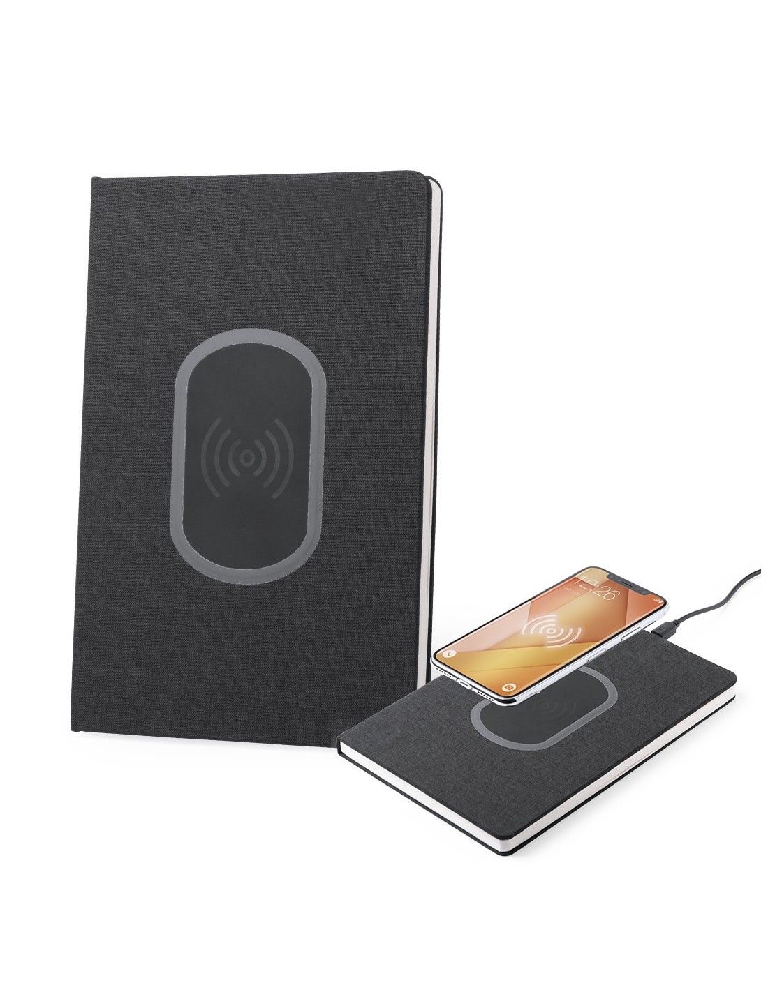Bloc de notas cargador en resistente poliéster 300D con cargador inalámbrico integrado. De sobrio diseño y original estación de carga en la portada. Incluye 80 hojas con disposición a una raya.