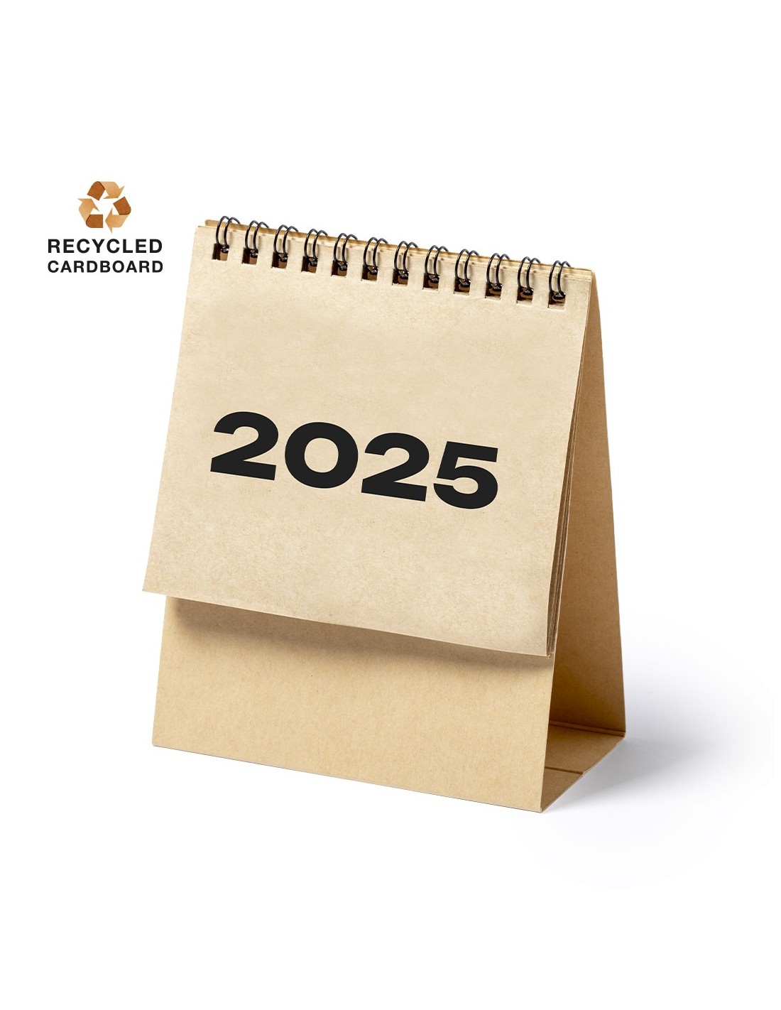 Calendario de sobremesa de línea nature. Fabricado en cartón reciclado, con anillas en color negro. Diseño mes en curso/ mes anterior/ mes siguiente. Amplia superficie de marcaje en ambas caras.