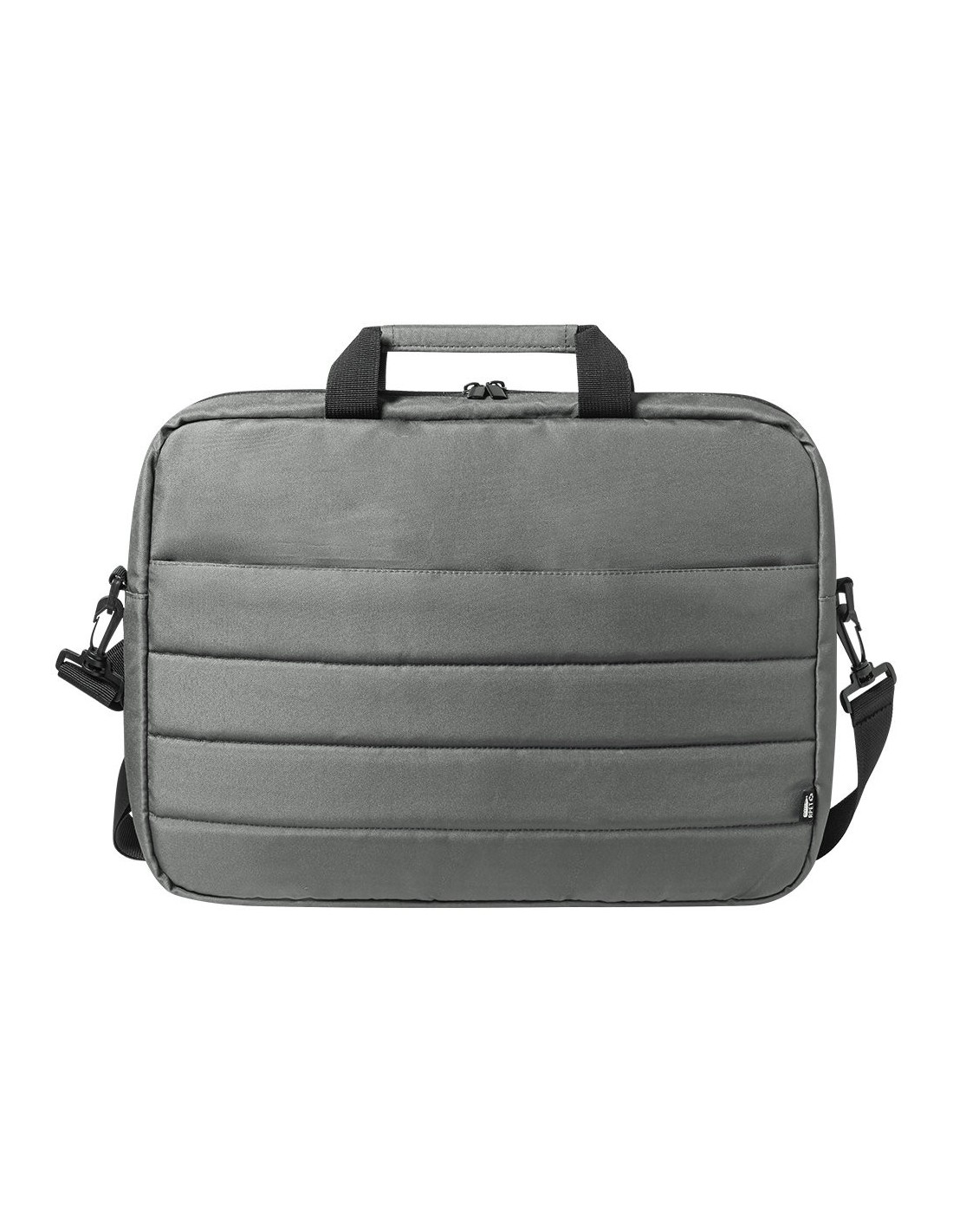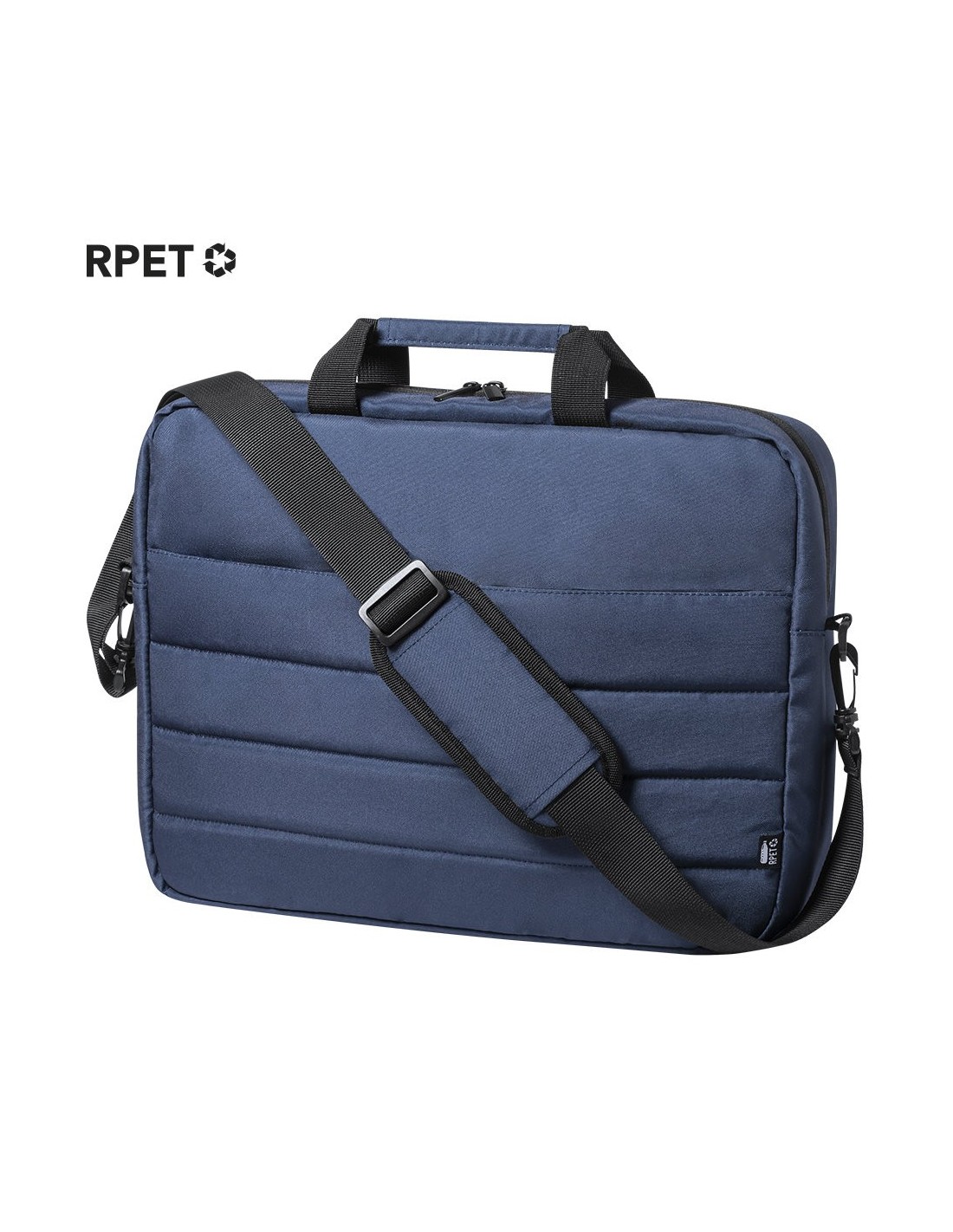 Maletín de línea nature con diseño urbano y acolchado total. Fabricado en resistente RPET 300D elaborado a partir de plástico reciclado, para así fomentar la reutilización de residuos plásticos y contribuir a la sostenibilidad del planeta. Accesorio para ajuste en trolley, con compartimento interior acolchado para ordenador portátil de hasta 15 pulgadas. Bolsillo principal con cierre de cremallera y tirador metálico. Cómodas asas de transporte reforzadas y cinta bandolera ajustable, con refuerzo acolchado para hombro y cierres giratorios de mosquetón. Distintivo RPET en etiqueta.