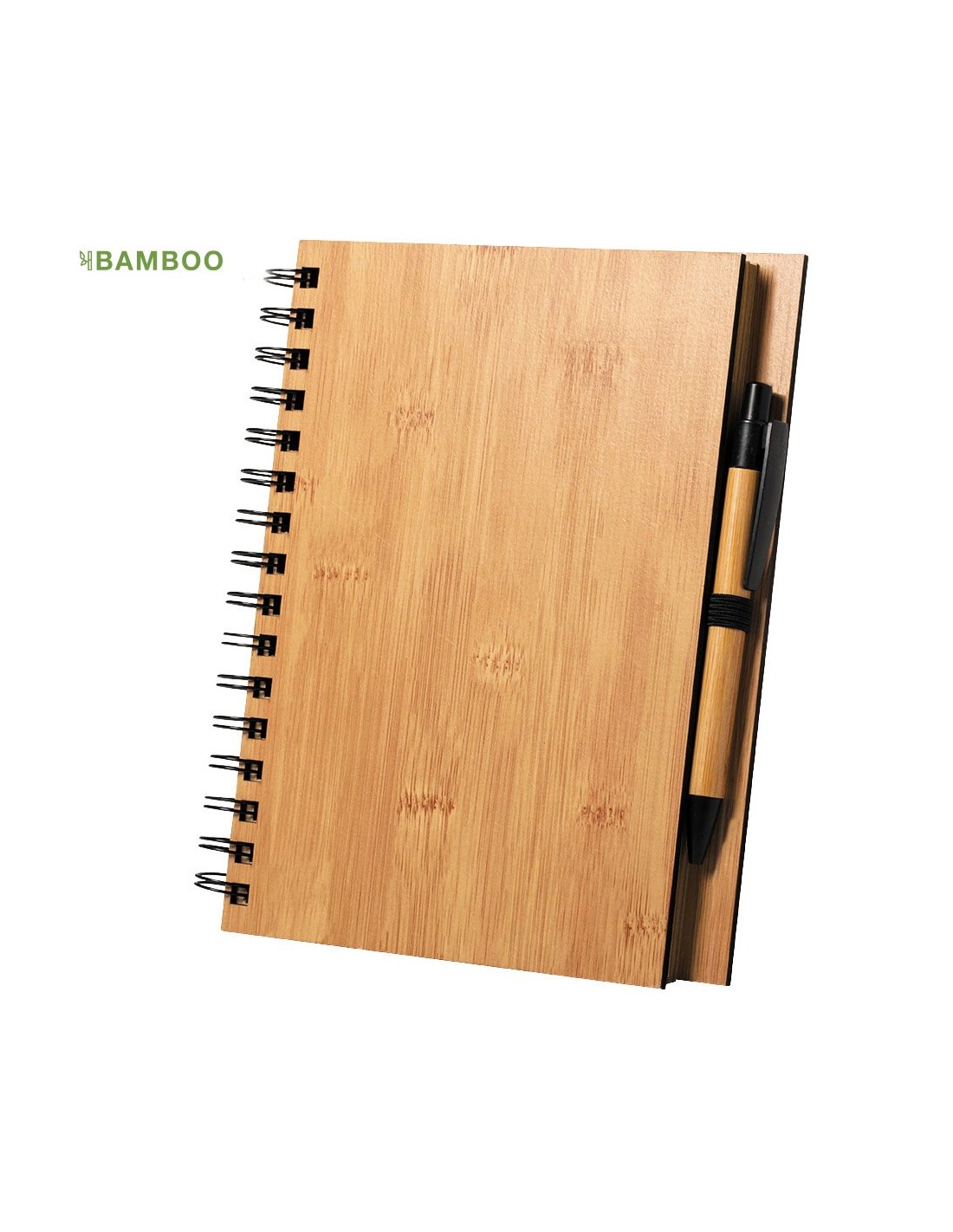 Set de libreta y bolígrafo de línea nature. Libreta de anillas con tapas rígidas en bambú, con soporte para el bolígrafo. De 80 hojas con diseño eco y disposición a una raya. Bolígrafo de mecanismo pulsador, con cuerpo de bambú y tinta negra.