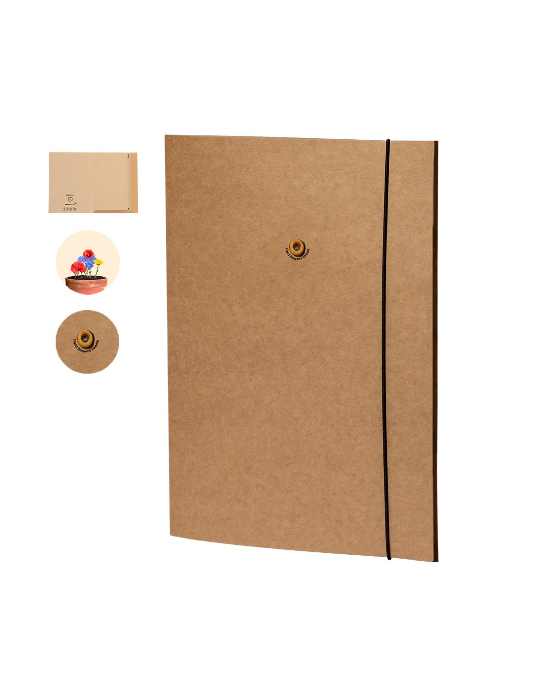 Carpeta con semillas fabricada en cartón reciclado. Tapa flexible, con interior especial para sujetar los folios y banda elástica de cierre. En la portada contiene una cápsula con semillas silvestres..El cartón reciclado proviene del reaprovechamiento de excedente de fabricaciones y reciclaje de papel en el final de su vida útil, convirtiéndose en un lienzo ecológico y sostenible.