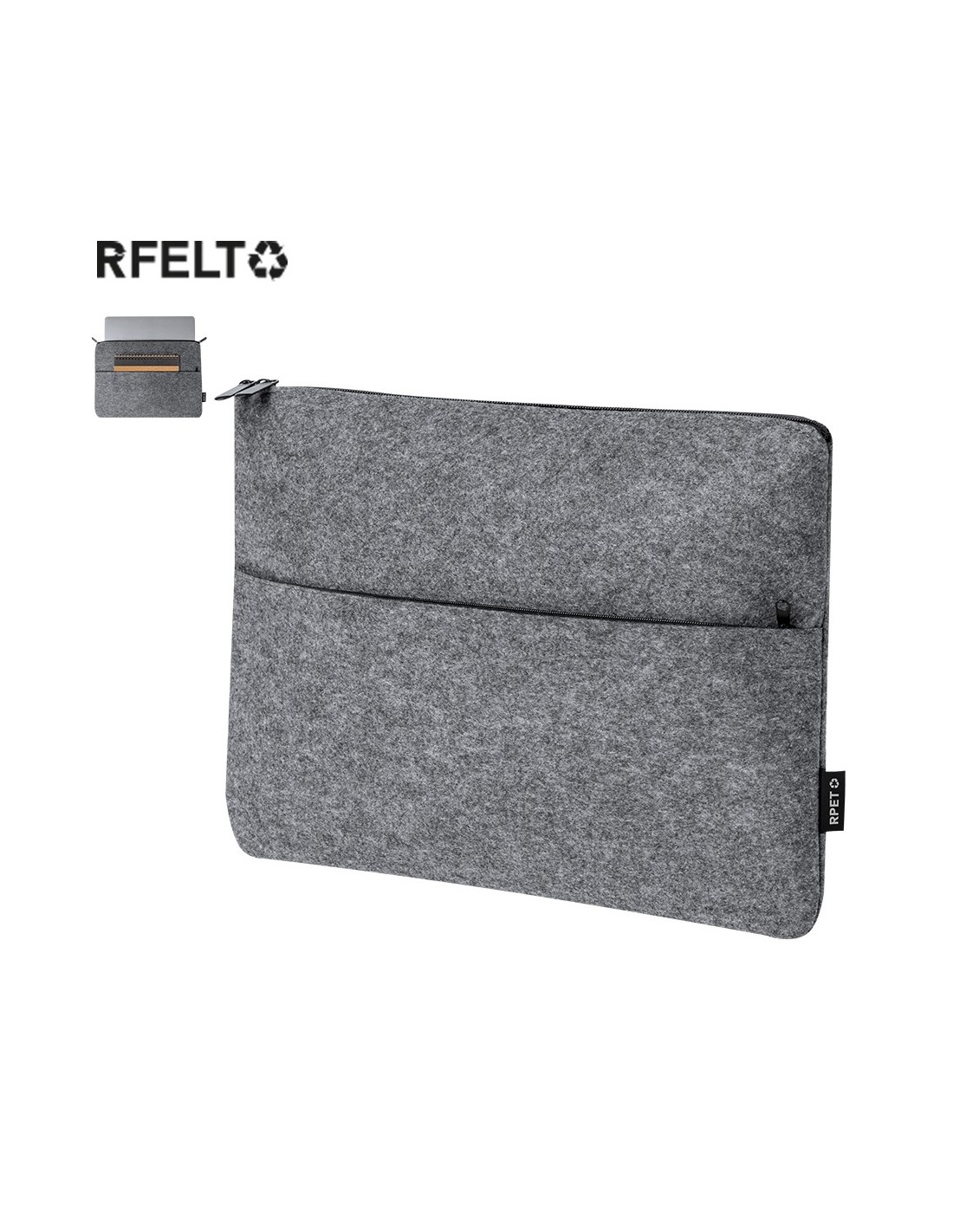 Funda para ordenador portátil fabricada en fieltro RPET. Bolsillo principal acolchado con cierre de cremallera, para portátiles de hasta 15 pulgadas, y bolsillo frontal para objetos más pequeños. Logotipo RPET en etiqueta. .El fieltro RPET es fruto de la combinación del proceso de reciclaje de materiales plásticos junto con la técnica milenaria de fabricación del fieltro, dando como resultado un material de eco-tendencia que, además de ser de origen reciclado, también se convierte en reciclable.