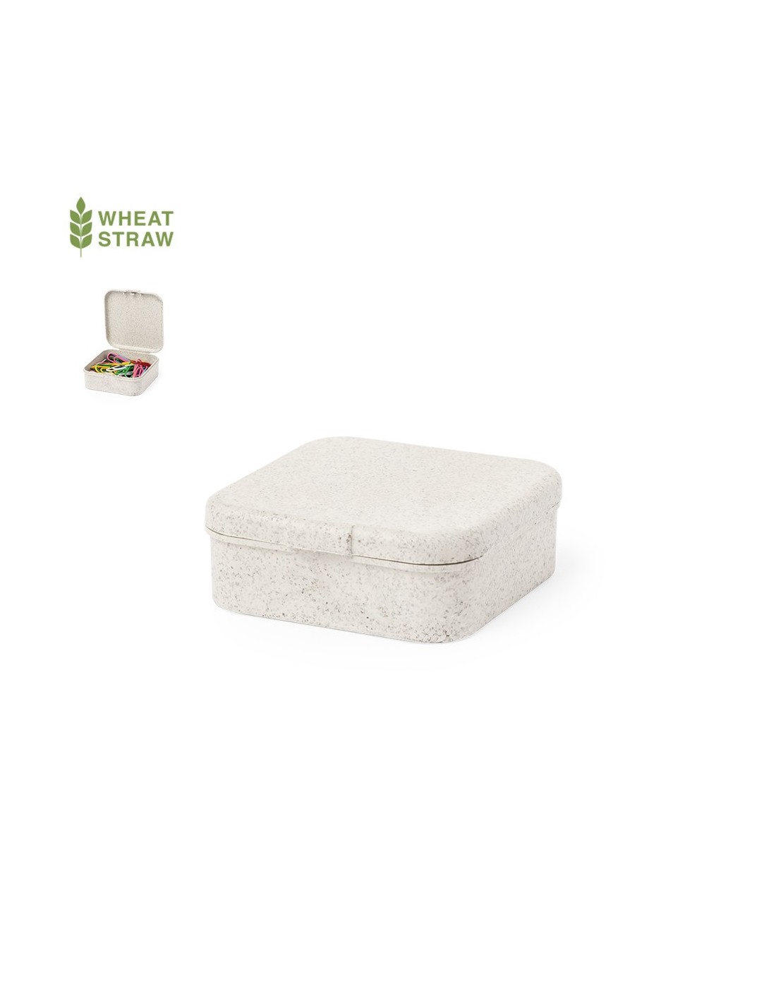 Útil portaclips fabricado en caña de trigo. Con cierre a presión y elaborada a partir de elementos reciclados, con 50 clips en su interior..La caña de trigo fomenta la utilización de materias primas naturales, reduciendo así las emisiones contaminantes.