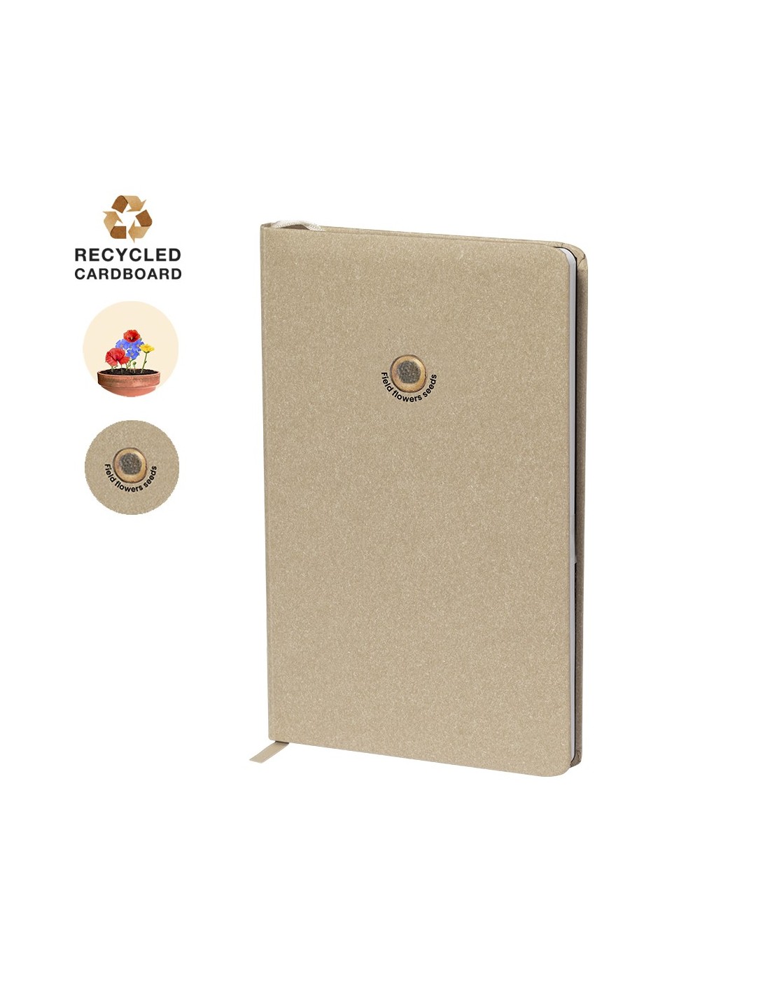 Bloc de notas de semillas fabricado en resistente cartón reciclado. Con tapas rígidas, marcapáginas y 80 hojas interiores con disposición a una raya en papel reciclado. Además, en la portada contiene una cápsula con semillas de flores silvestres, en colores surtidos y con instrucciones de plantado en la cubierta trasera..El cartón reciclado proviene del reaprovechamiento de excedente de fabricaciones y reciclaje de papel en el final de su vida útil, convirtiéndose en un lienzo ecológico y sostenible.