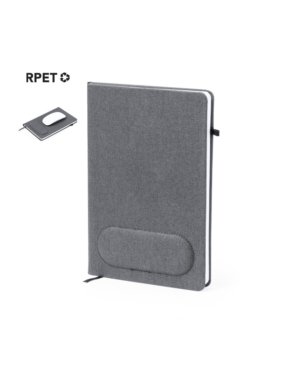 Libreta alfombrilla elaborada en RPET 300D con tapas rígidas. Destaca por su original soporte en la portada con forma ergonómica para la muñeca y así poder usarse como alfombrilla de ratón. Incluye marcapáginas y un soporte para bolígrafo a juego. Contiene 100 hojas interiores lisas y está disponible en un elegante color gris. Con logotipo RPET en contraportada y presentada en bolsa individual reciclada..El material RPET se elabora a partir de plástico reciclado, para así fomentar la reutilización de residuos plásticos y ayudar a la sostenibilidad del planeta.