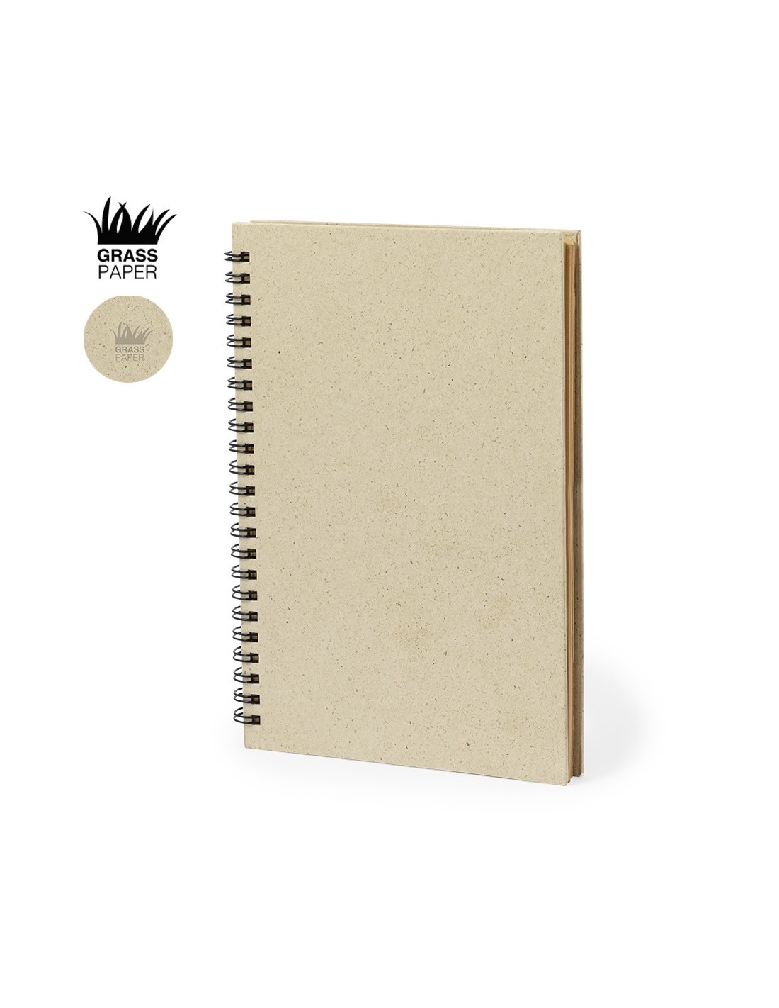 Libreta de anillas dobles A5 con tapas duras fabricadas a partir de hierbas recicladas. 80 hojas con disposición a una raya, de acabado kraft. Logotipo Grass Paper en hojas y contraportada. Presentado en una bolsa individual. .El papel de hierba es una alternativa perfecta que garantiza la sostenibilidad en su proceso de fabricación, reduciendo el impacto medioambiental debido al rápido crecimiento y a la baja demanda de recursos necesarios para cultivarlo. Además en su elaboración se combina un 50% de base de hierba con otros elementos ecológicos, como madera reciclada.