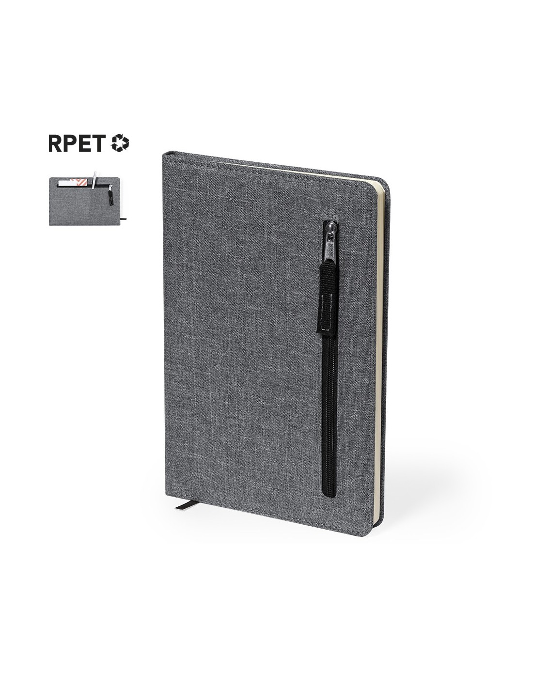 Bloc de notas fabricado en RPET 300D. Con tapas duras y bolsillo exterior con cierre de cremallera, incluye 100 hojas a una raya con marcapáginas. De elegante color gris y presentado individualmente en bolsa reciclada. Logotipo RPET en contraportada..El material RPET se elabora a partir de plástico reciclado, para así fomentar la reutilización de residuos plásticos y ayudar a la sostenibilidad del planeta.