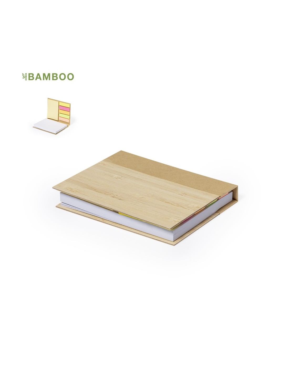 Bloc de notas de 70 hojas con tapas rígidas de bambú. Interior con 25 notas adhesivas 7,5x5cm y 125 mininotas adhesivas de 4,5x1,2cm en 5 colores diferentes. Presentado en bolsa de papel individual..Materiales como el bambú fomentan la utilización de materias primas naturales, reduciendo las emisiones contaminantes. Proviene de una planta de gran resistencia y versatilidad, con crecimiento y regeneración rápidos, siendo una excelente alternativa al uso de madera tradicional.
