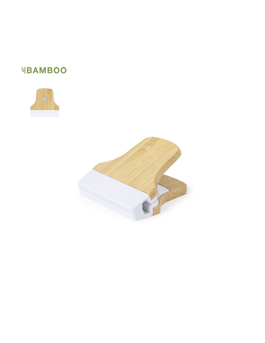Pinza porta notas fabricada en bambú. Con potente imán para poner en superficies metálicas, de diseño bicolor en blanco y madera bambú. Presentado individualmente en una bolsa. Materiales como el bambú fomentan la utilización de materias primas naturales, reduciendo las emisiones contaminantes. Proviene de una planta de gran resistencia y versatilidad, con crecimiento y regeneración rápidos, siendo una excelente alternativa al uso de madera tradicional.