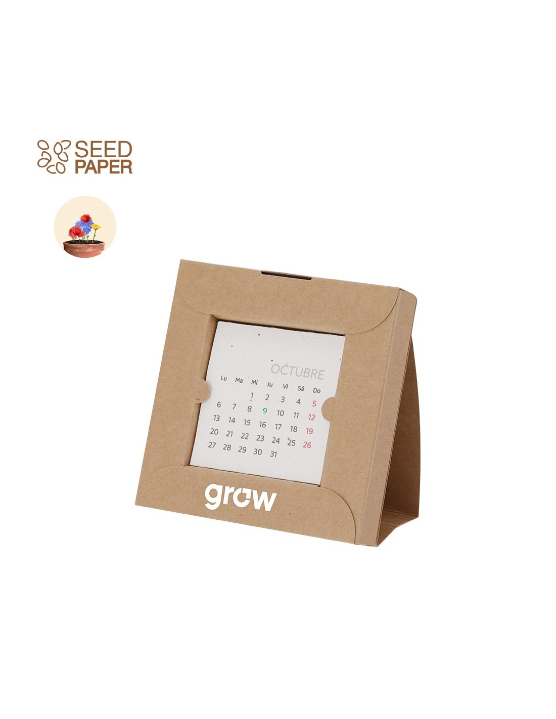 Calendario plantable fabricado en papel de semilla. Incluye 13 hojas con semillas de petunia de colores surtidos, convirtiéndolo en papel plantable después de su vida útil. Diseño de mes en curso, con festividades nacionales marcadas en rojo y autonómicas en verde. Presentado en caja soporte de cartón.