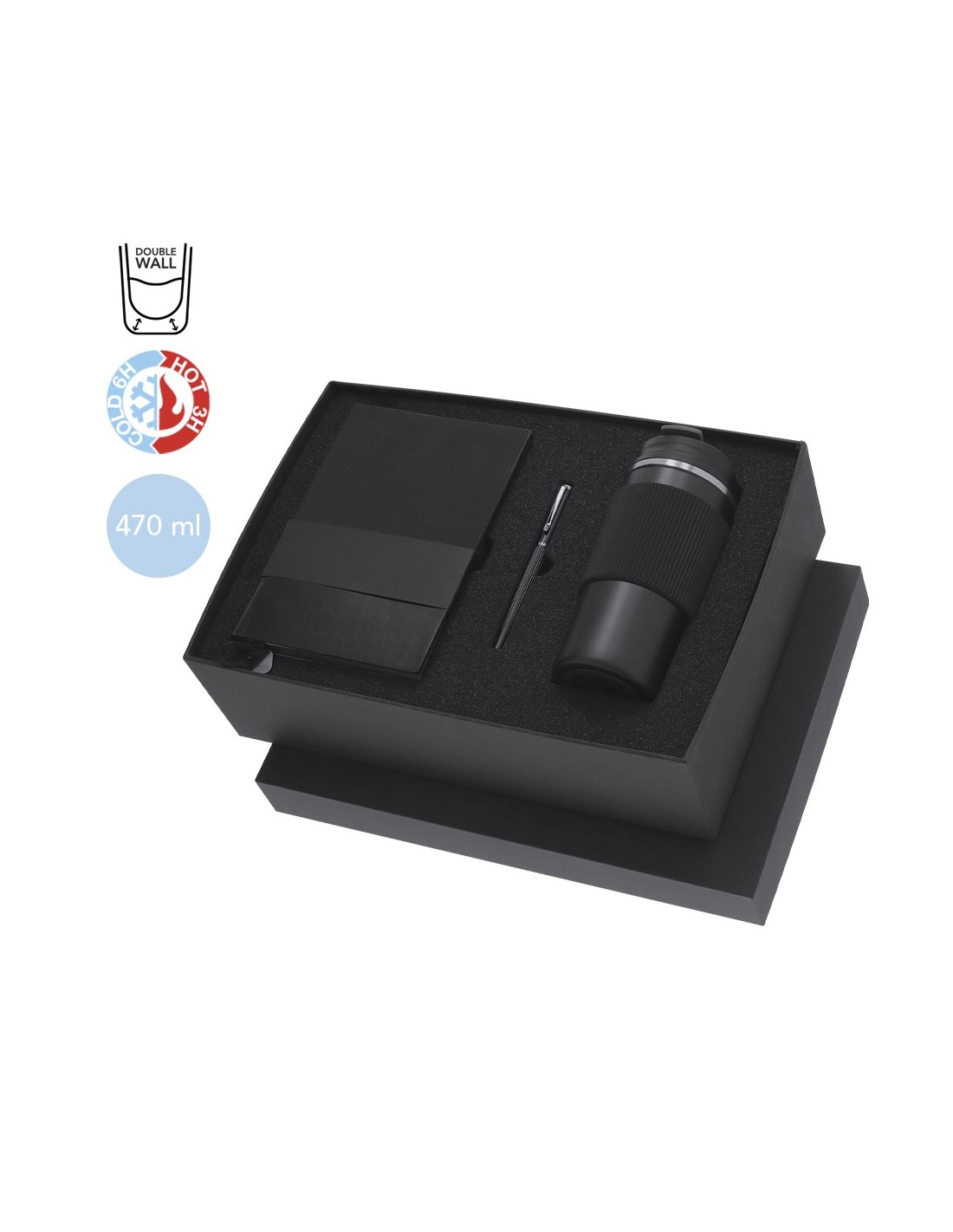 Elegante set premium. Incluye: Vaso térmico fabricado en acero inoxidable de doble pared con capacidad de 470 ml. Con un dosificador en tapadera, libre de BPA, sistema de apertura abre fácil, banda de silicona a juego y base antideslizante. Bloc de notas con tapas blandas fabricado en elegante PU color negro. Su diseño combina texturas lisas y biseladas. Incluye marcapáginas de tela con accesorio metálico especial para marcaje en láser. Interior con 100 hojas en color crema, de disposición a una raya y bordes en negro. Roller de acabado negro mate con detalles metálicos en color plata. De cuerpo biselado, con cierre de capucha, clip y tinta azul. Cuenta con cómodo agarre en metal pulido. Presentado en sosfisticado estuche individual de acabado mate, con interior troquelado para cada uno de los elementos del set.