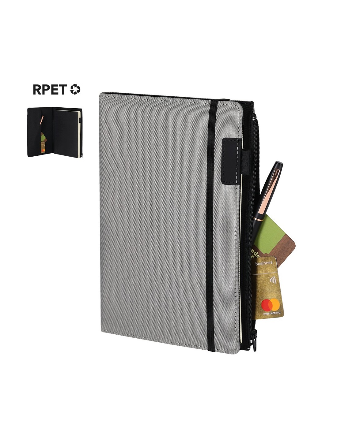 Bloc de Notas con Funda. Incluye:- Bloc de notas interior tamaño A5, con tapas rígidas y 100 hojas de disposición a una raya. - Funda fabricada en RPET 600D, con práctico bolsillo lateral de cremallera, ideal para tener siempre a mano los objetos personales. Además, es extraíble y reutilizable en otros modelos de bloc, convirtiéndose en una solución versátil y sostenible. Incluye soporte para bolígrafo y cierre elástico en color negro. Con logotipo RPET en contraportada.El material RPET se elabora a partir de plástico reciclado, para así fomentar la reutilización de residuos plásticos y ayudar a la sostenibilidad del planeta.