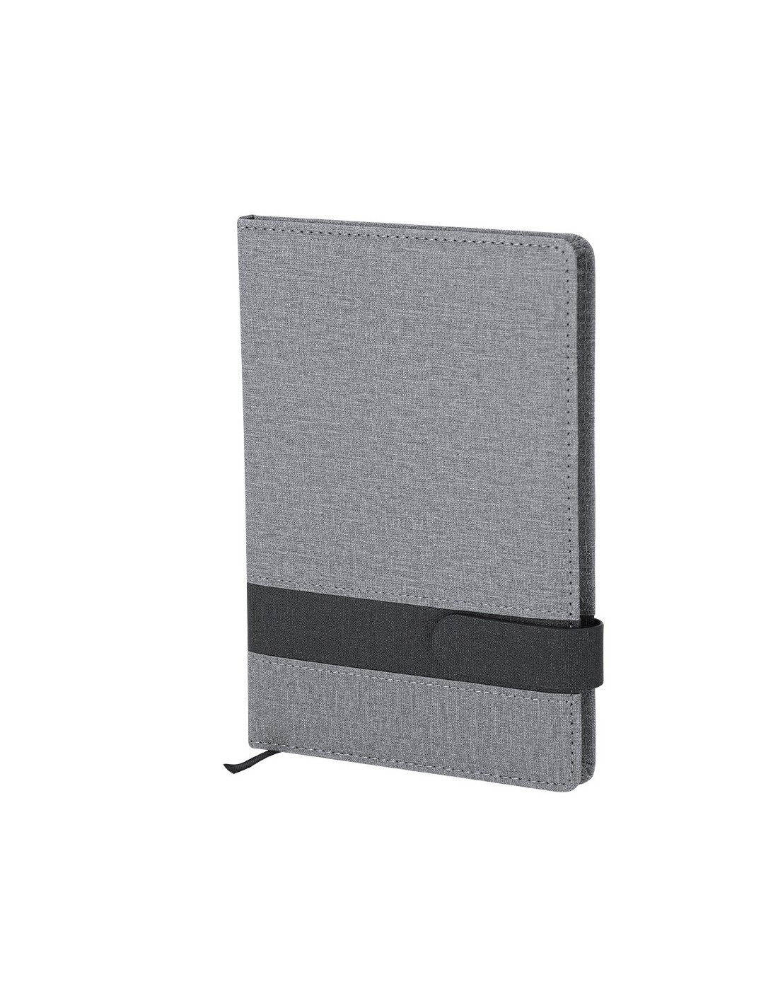 Bloc de notas A5 fabricado en PU. Elegante diseño gris con banda negra de cierre magnético a juego. Interior con 80 hojas color crema de disposición a una raya y marcapáginas de tela a juego.