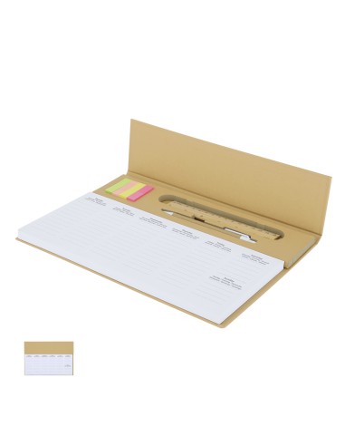 Planificador Semanal. 125 Hojas. 7 Idiomas. 100 Mininotas Adhesivas 1,2 x 4,5 cm. Bolígrafo Cartón Reciclado y Regla Madera Incluida