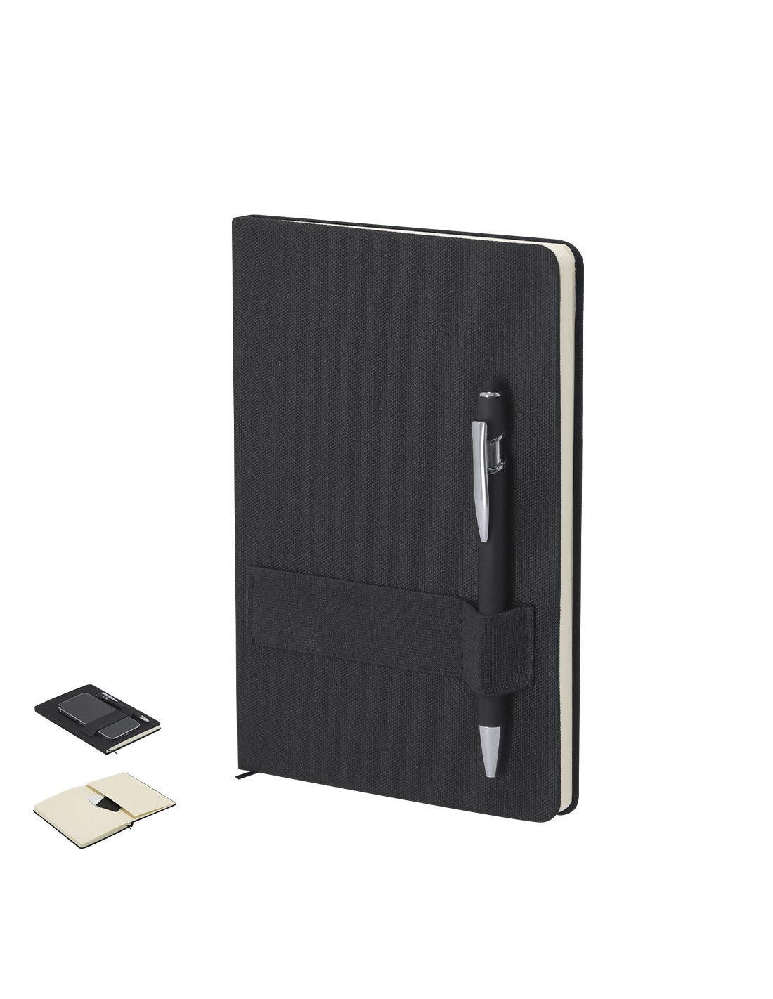 Bloc de notas en tamaño A5 fabricado en elegante RPET. Portadas rígidas en acabado tela. Incluye banda elástica en la tapa, ideal para sujetar móvil y portabolígrafos elástico. Interior con 80 páginas a disposición de una raya, marcapáginas de cinta en combinación y sobre en las contraportadas. Incluye bolígrafo con tinta azul, cuerpo de aluminio acabado goma, clip metálico y tiene acción por pulsador en combinación. Presenta distintivo logotipo RPET.