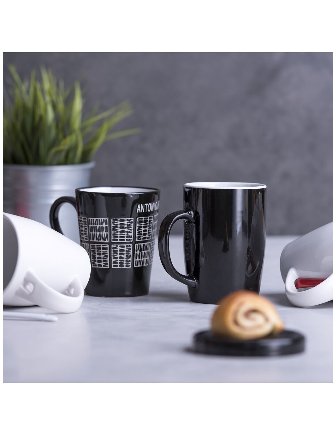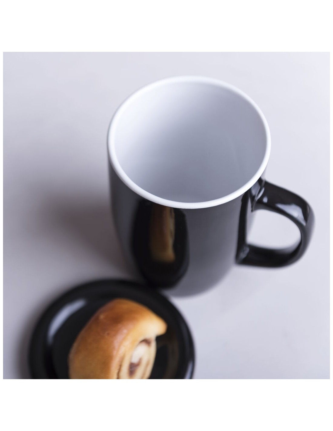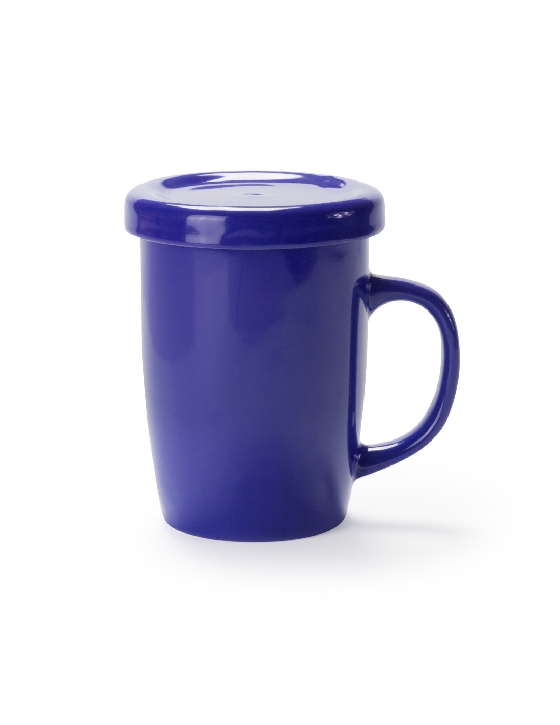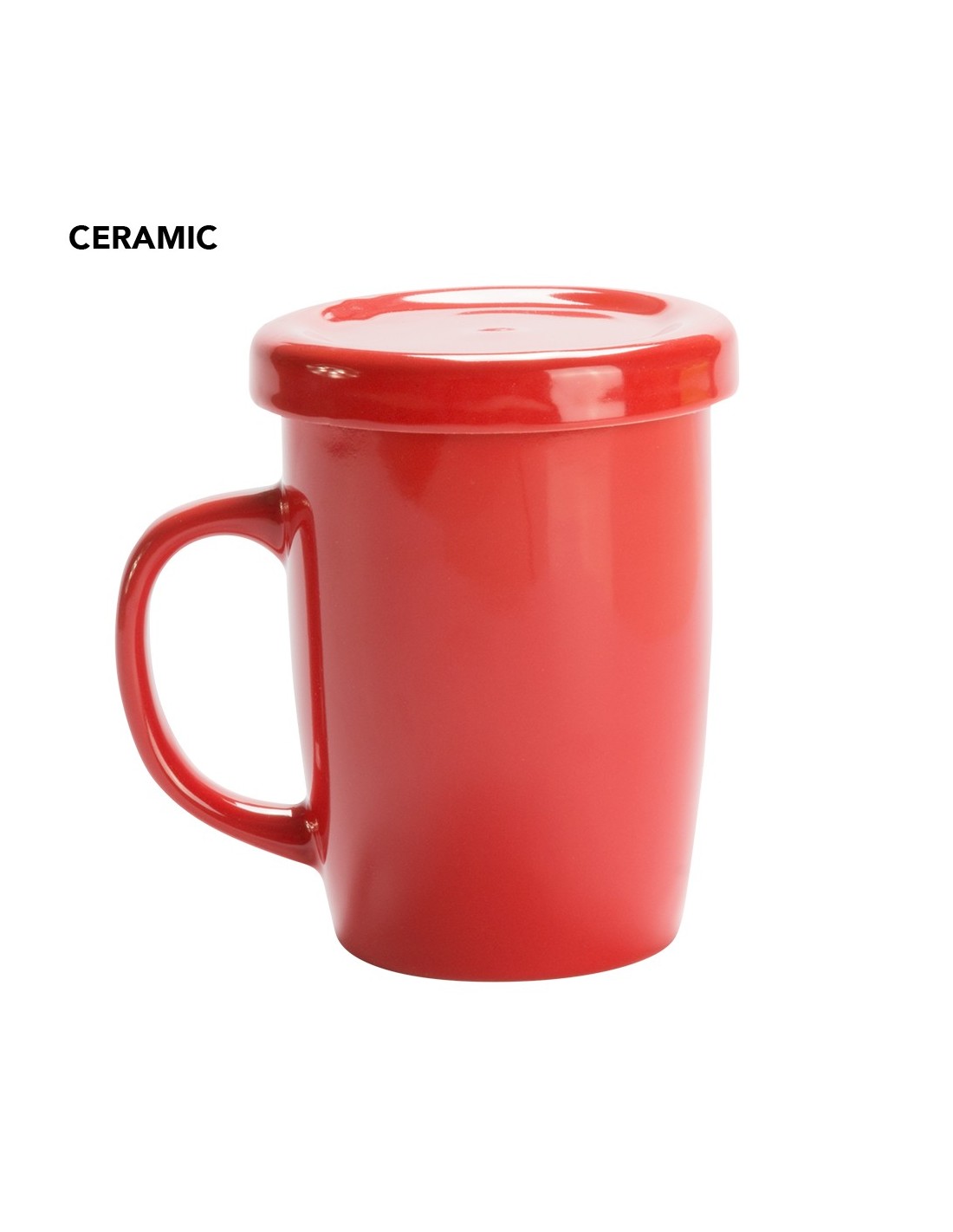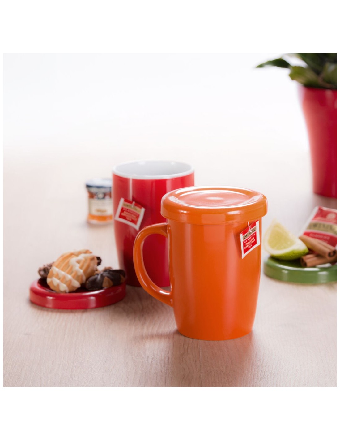 Taza de cerámica de 380ml de capacidad en divertida y amplia gama de vivos colores. Con tapadera especialmente diseñada como soporte de bolsitas de te. Presentada en caja individual.