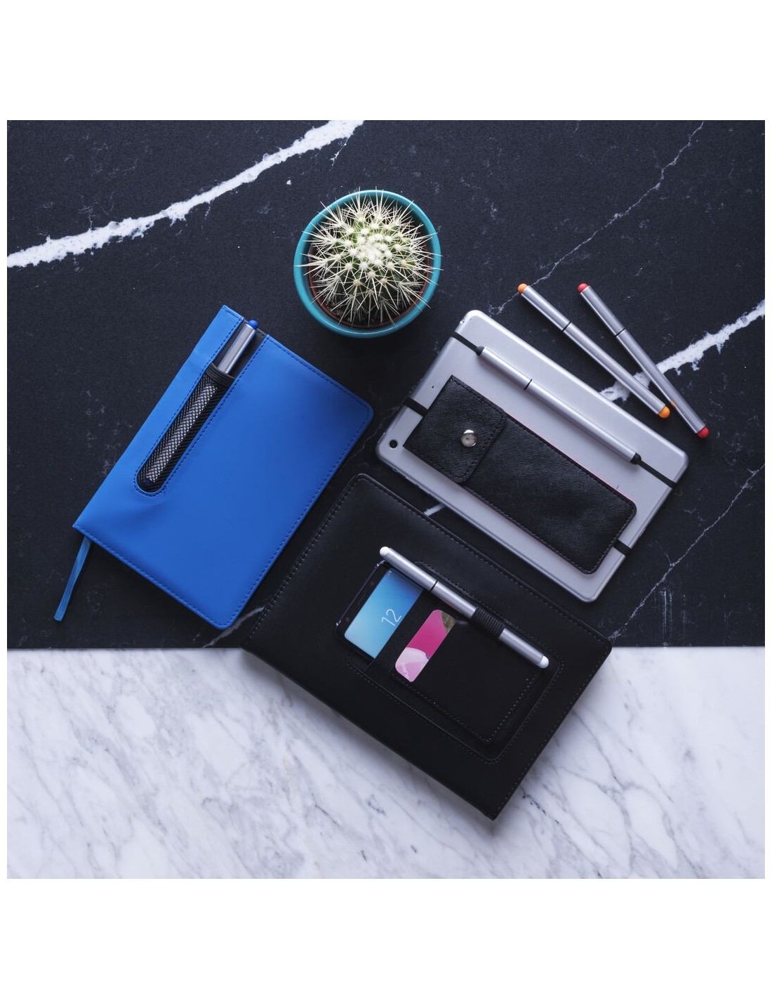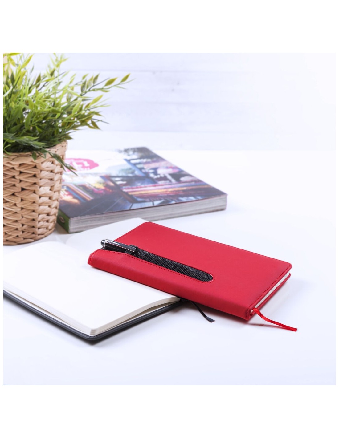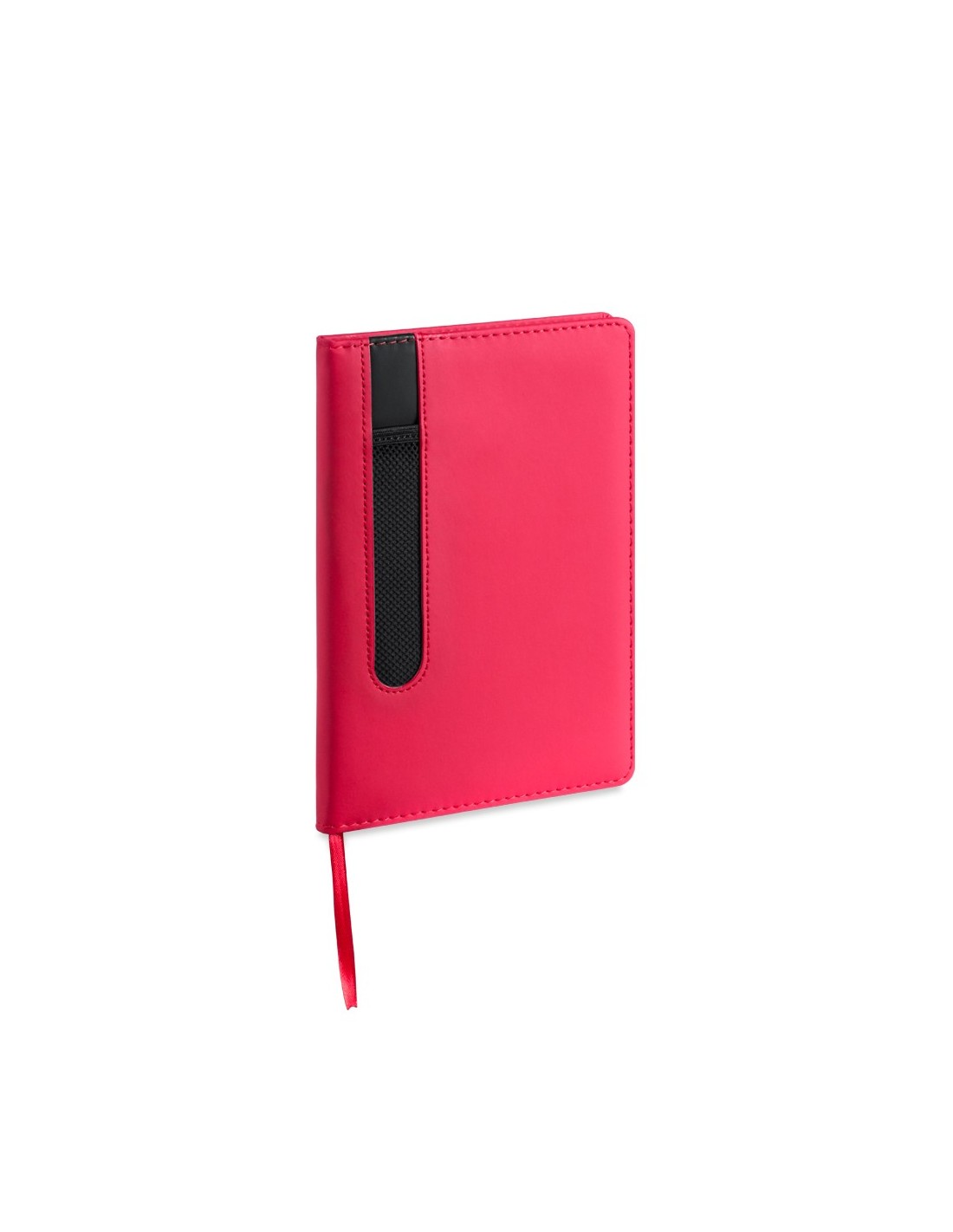 Bloc de notas con tapas de suave tacto acabadas en polipiel y con funda para bolígrafo integrada en contraportada. De 80 hojas lisas, con elástico de sujeción y marcapáginas de tela a juego.