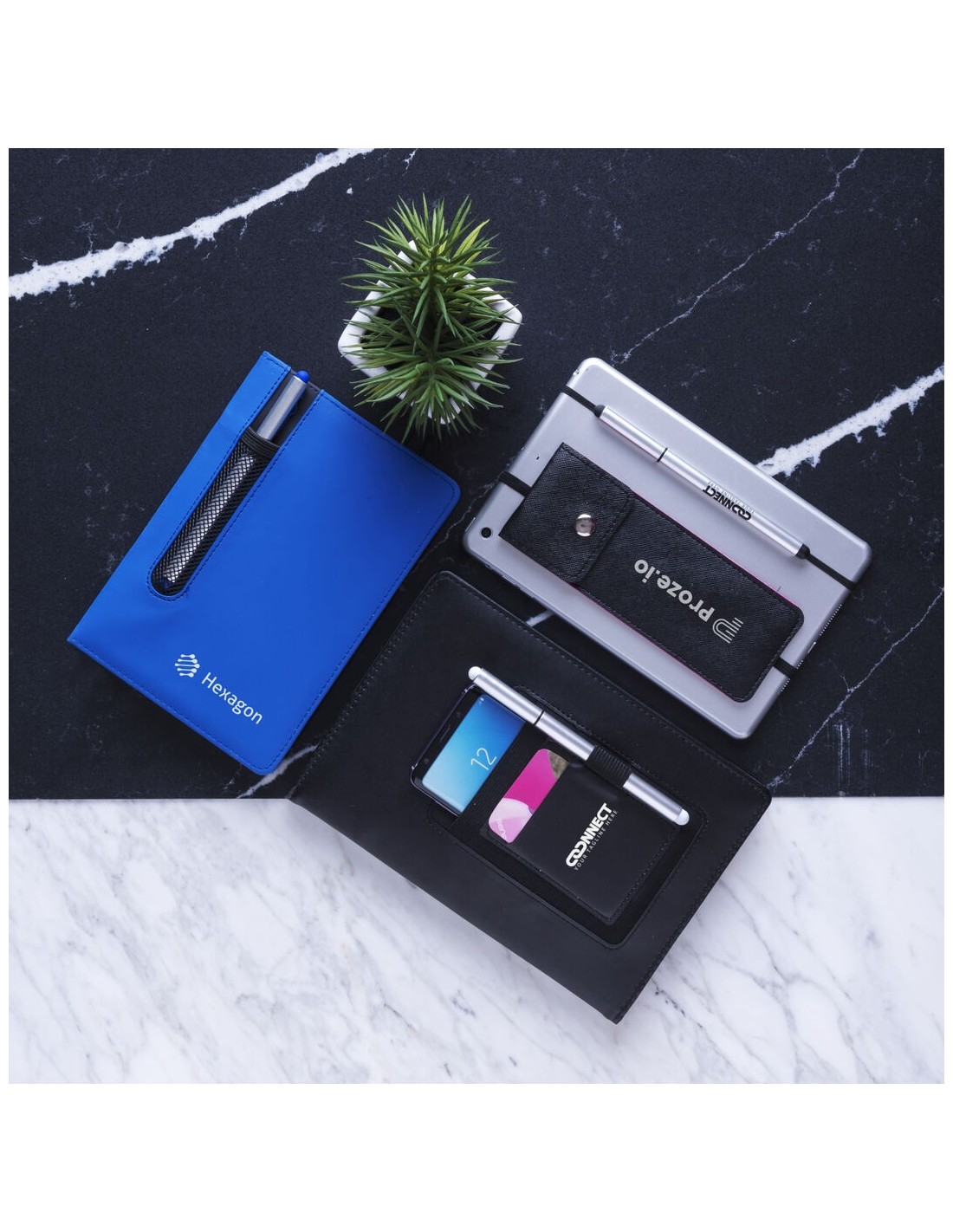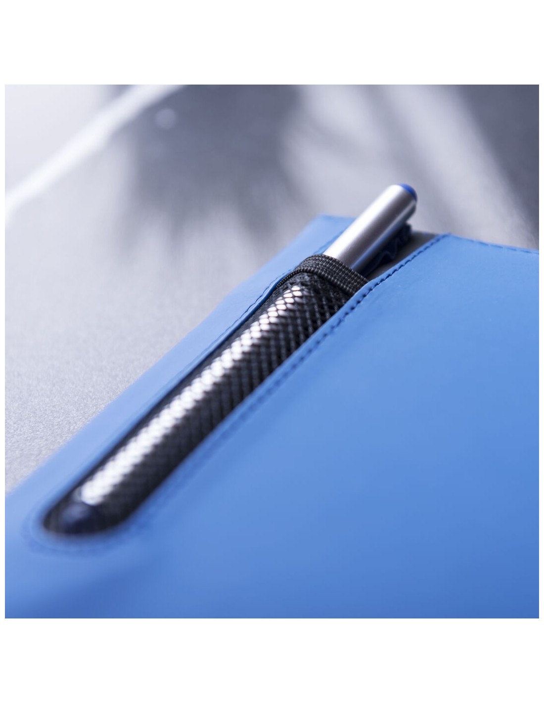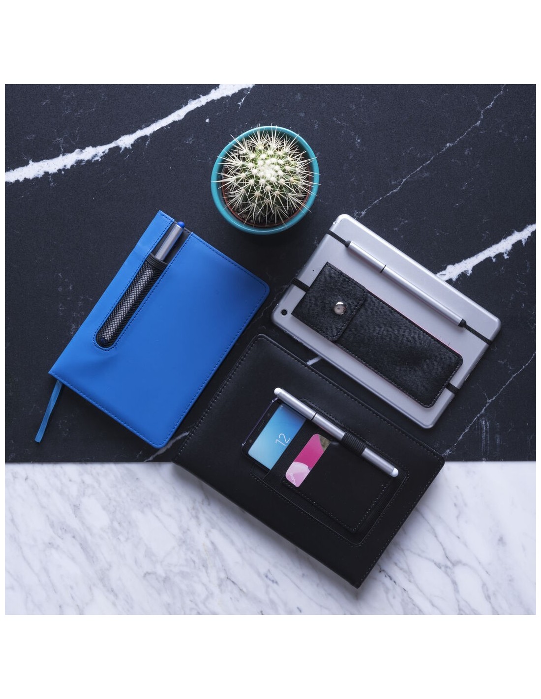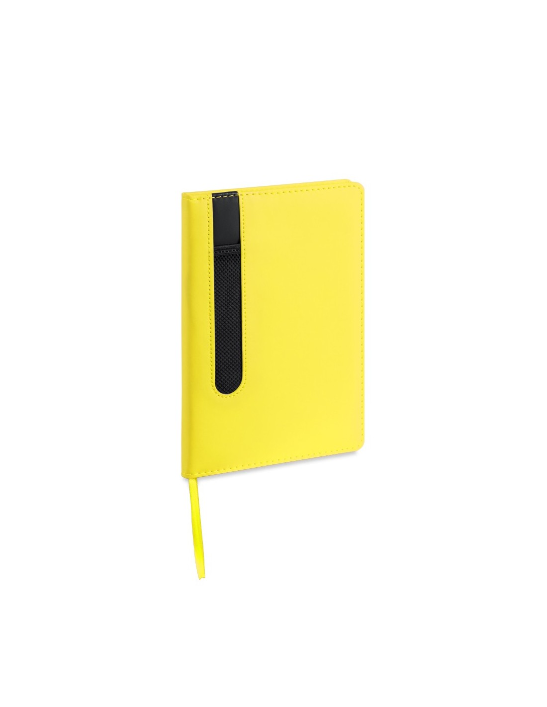 Bloc de notas con tapas de suave tacto acabadas en polipiel y con funda para bolígrafo integrada en contraportada. De 80 hojas lisas, con elástico de sujeción y marcapáginas de tela a juego.