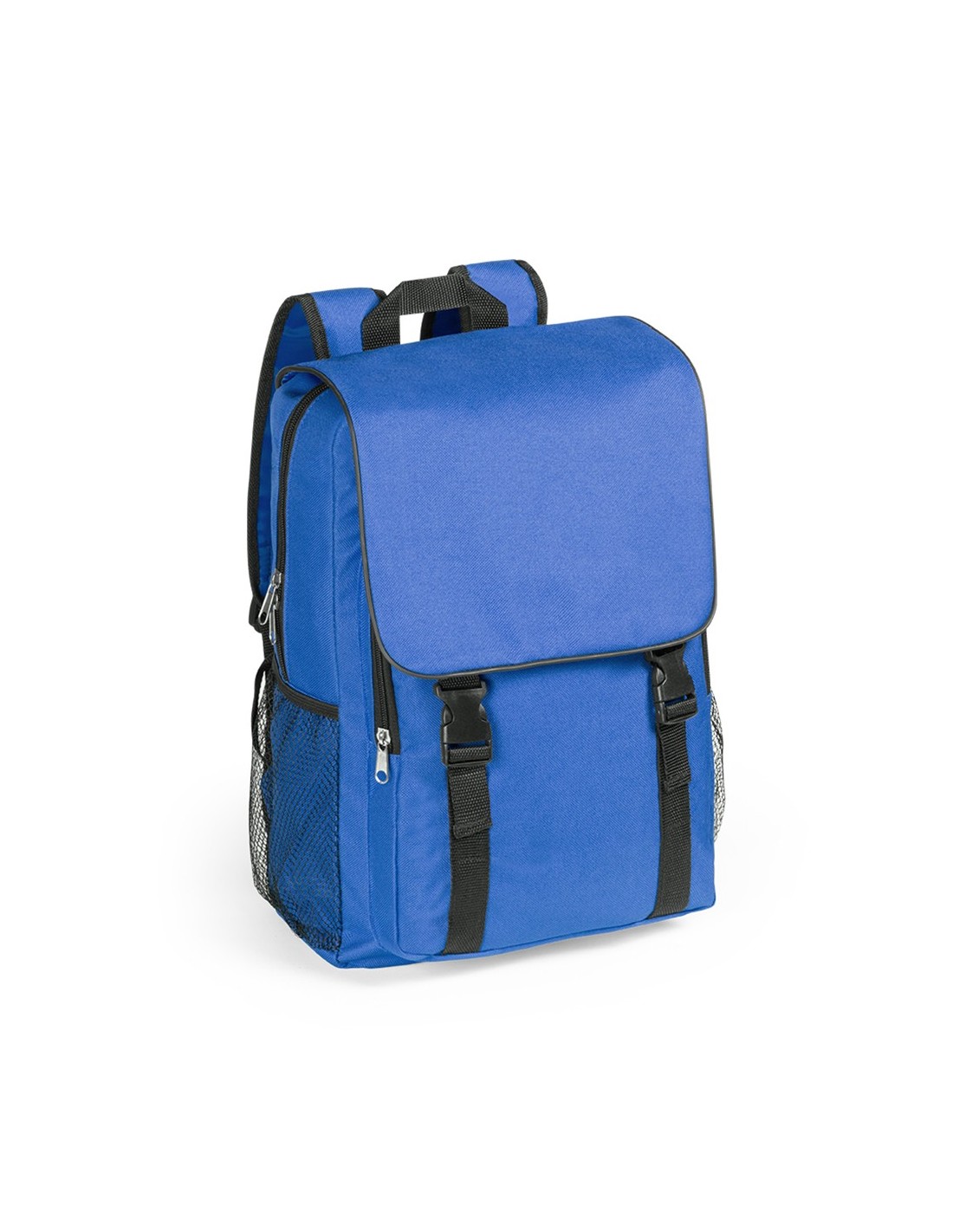 Mochila en resistente poliéster 600D de desenfadado diseño en variada gama de colores. Solapa con cierre de clic, cierre de cremallera de doble tirador y bolsillo en frontal. Bolsillos de redecilla elástica en los lados, con esquinas reforzadas y accesori