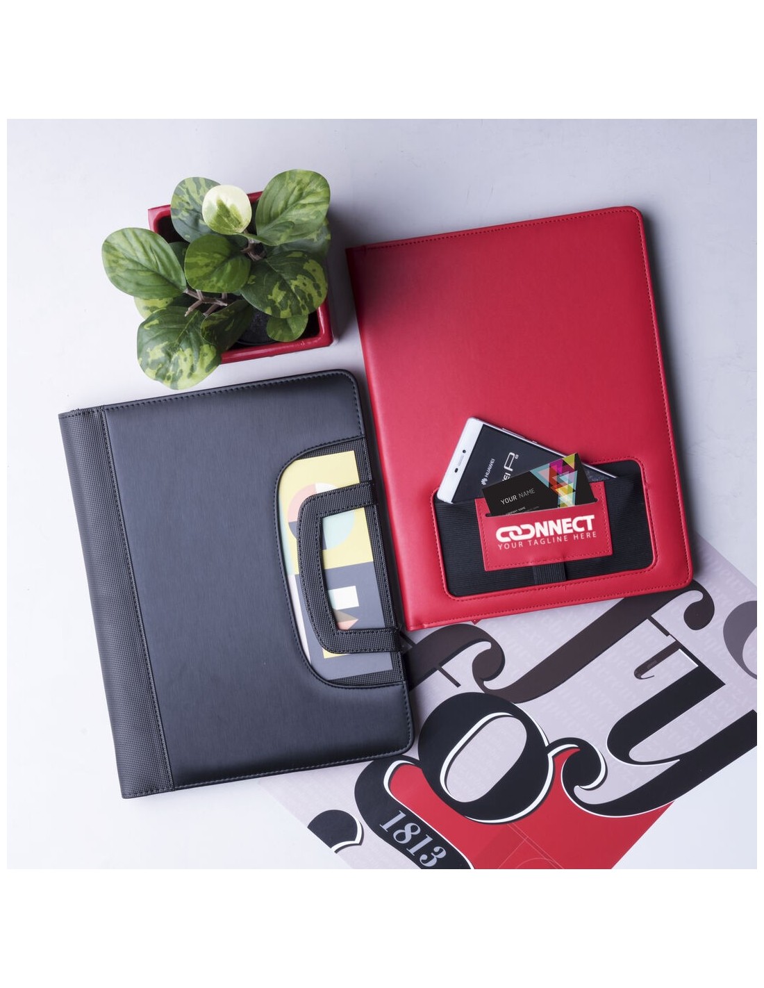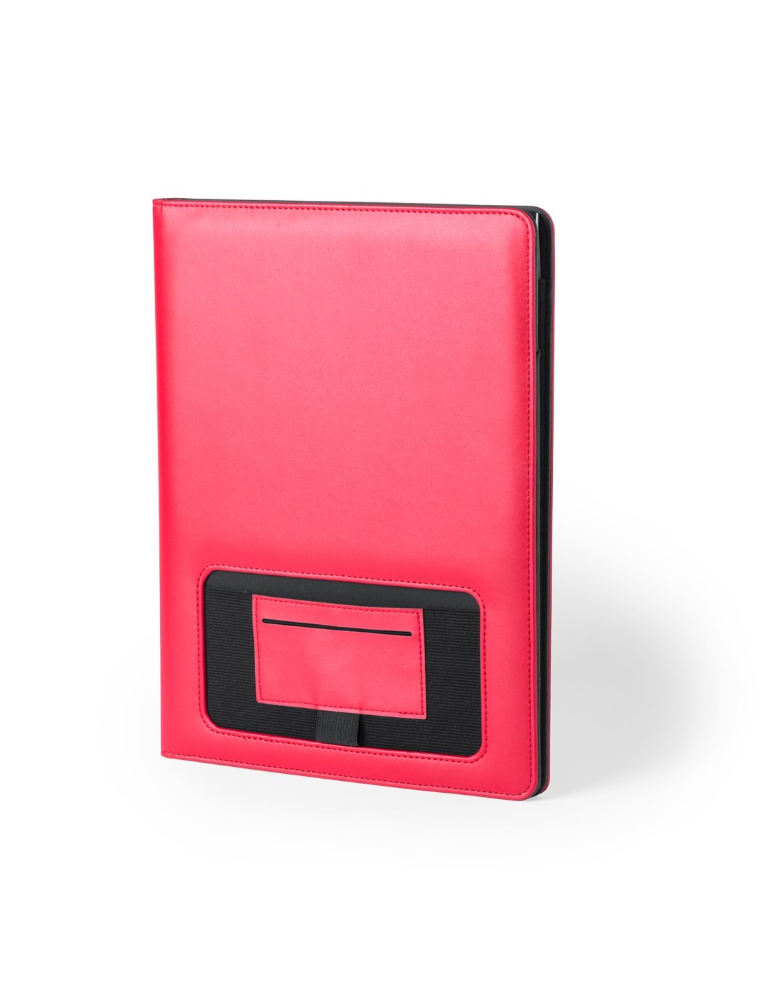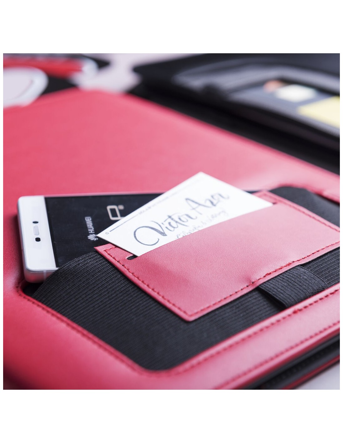 Carpeta tecnológica de alta calidad en vivos colores acabada en suave polipiel y original diseño con bolsillo en portada. Interior con soporte para tablet de hasta 10, soporte para smartphone, bloc extraíble de 20 hojas de distribución a una raya, con ca