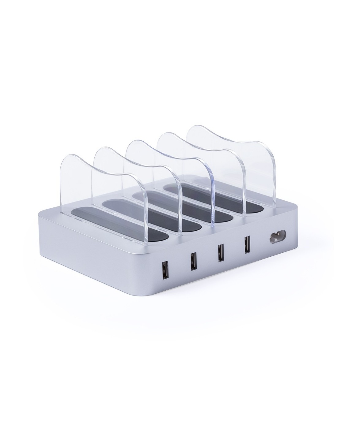 Estación de carga USB con e 6.800 mAh de capacidad de carga para alimentar simultáneamente hasta 4 dispositivos móviles. Con base anti deslizante y compartimentos individuales para cada dispositivo. Incluye cable de carga para enchufe de pared y viene pre