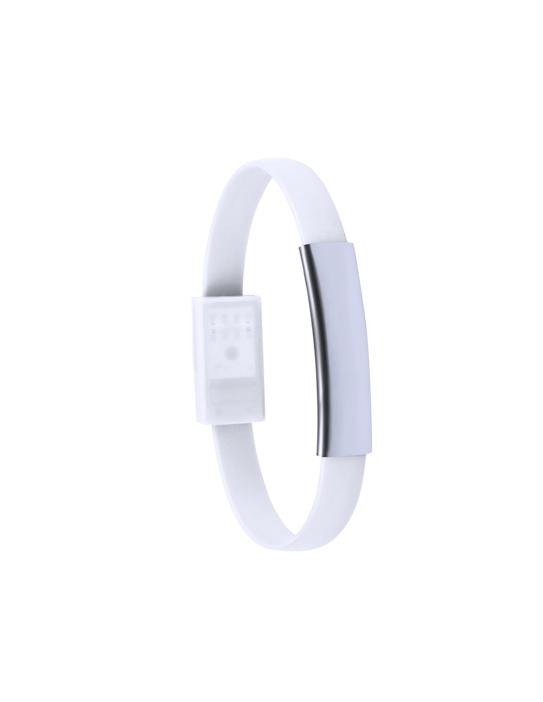 Pulsera-cable cargador en suave goma, con conexión dual Micro USB y Lightning. Elegante pieza central de aluminio especialmente diseñada para marcaje en láser. Presentada en atractiva bolsa de diseño con autocierre.