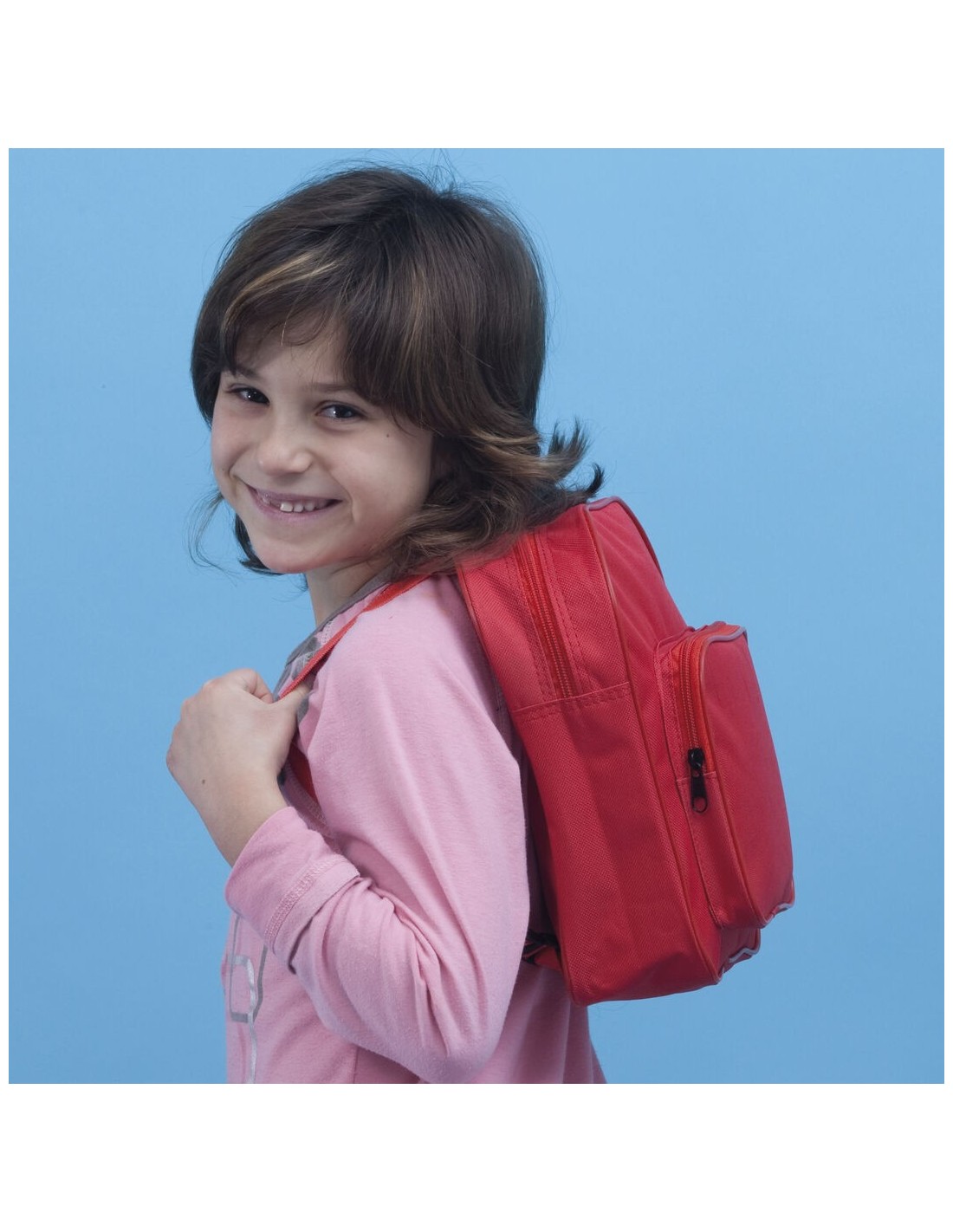 Mochila para niño en resistente poliéster 600D de desenfadado diseño en alegre gama de colores y con ribete de refuerzo a juego. Con cierre de cremallera a juego, bolsillo frontal y esquinas reforzadas. Cintas de hombros ajustables a juego.