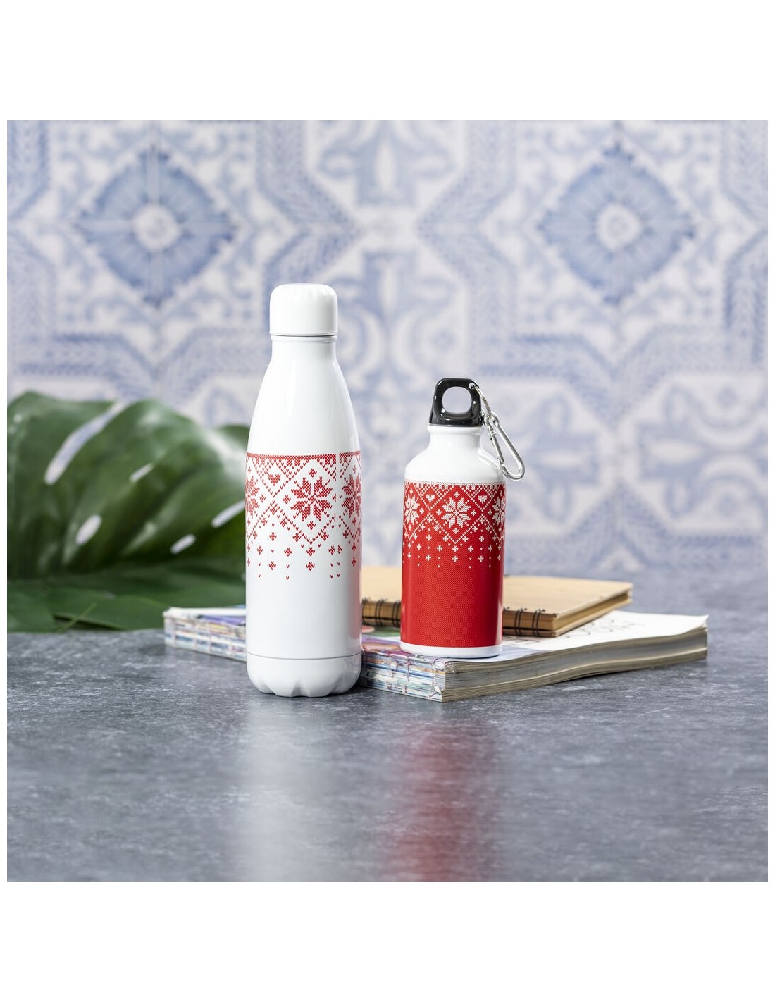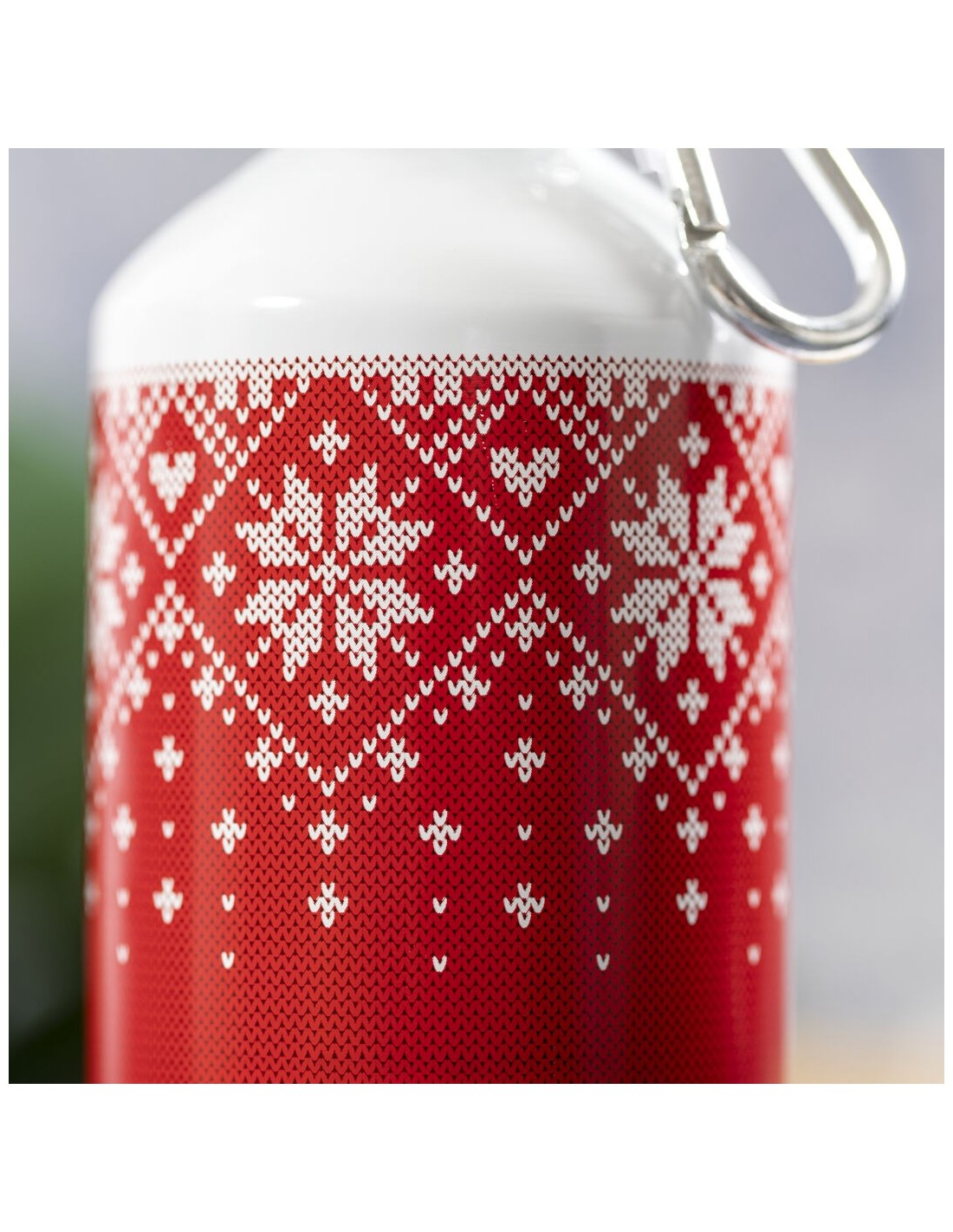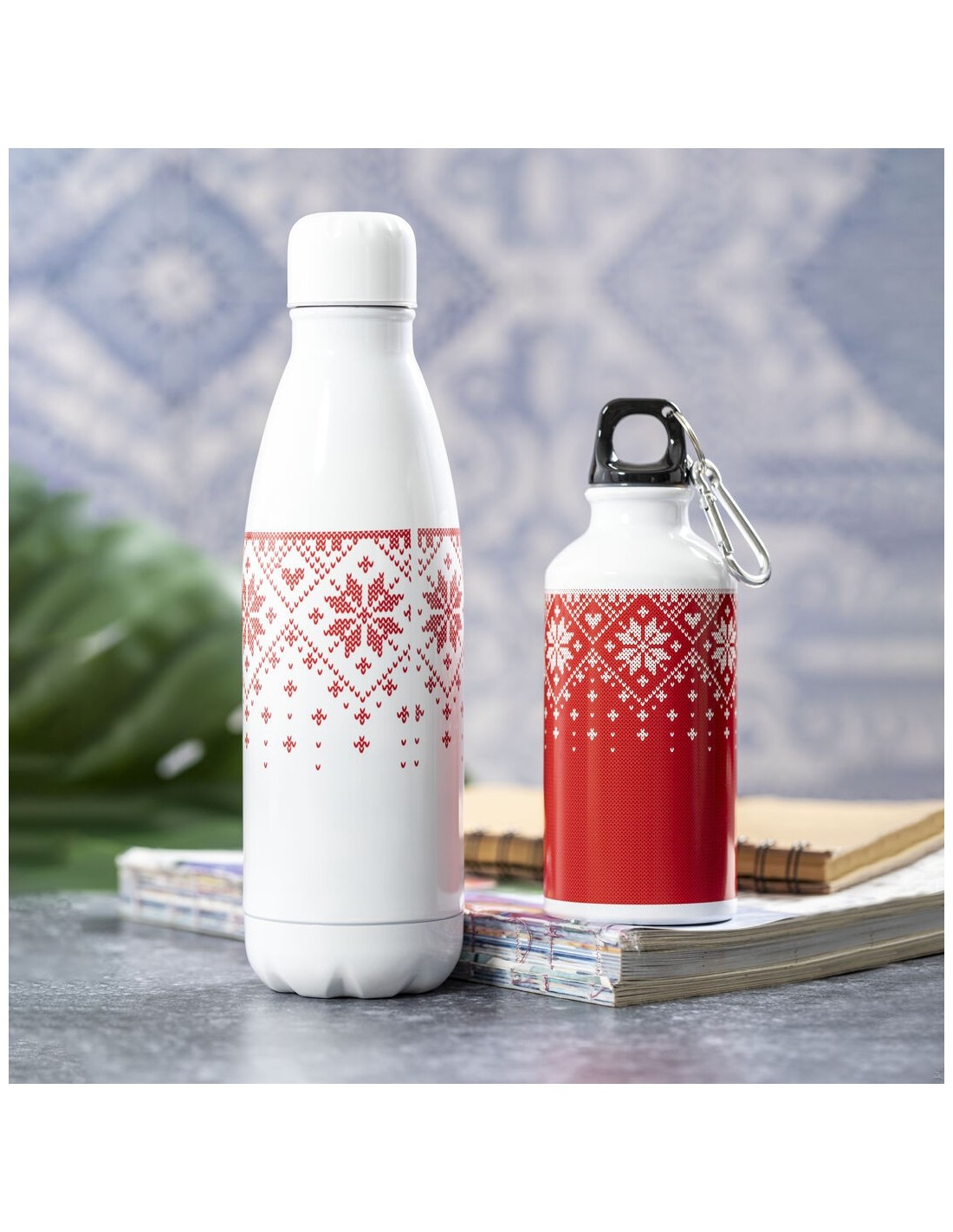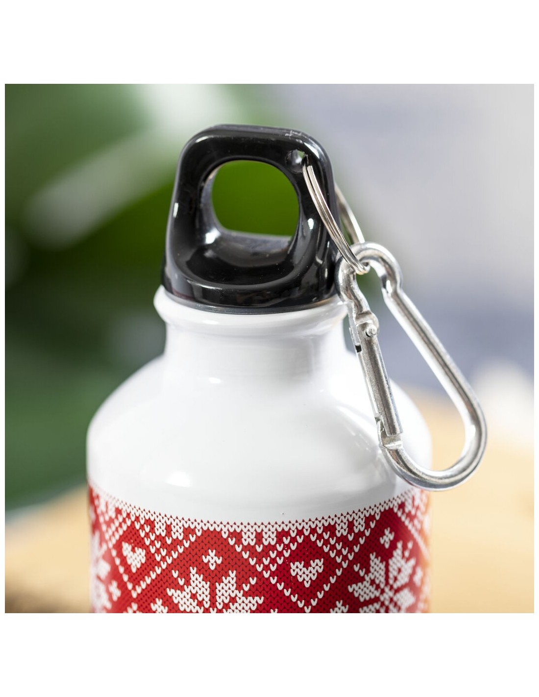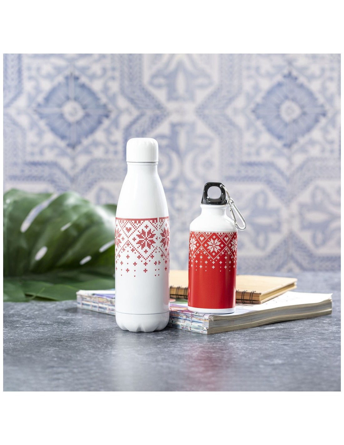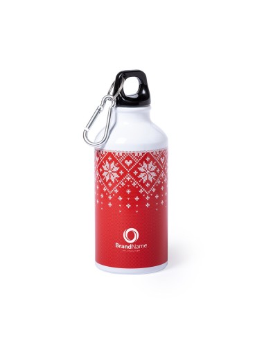 Bidón de 400ml de capacidad con cuerpo de acabado aluminio, en diseño bicolor de navidad. Con tapón de seguridad a rosca y mosquetón metálico de transporte. Presentado en atractiva caja de diseño.