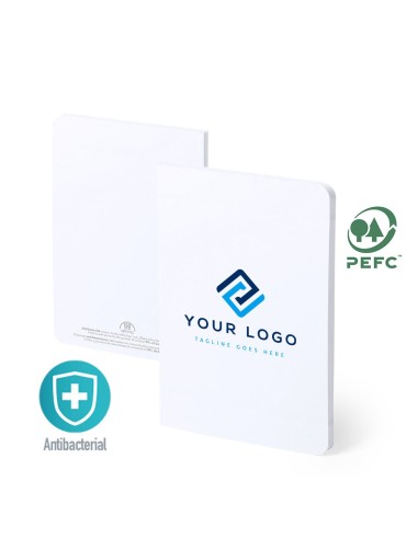 Libreta tamaño A5 con tapas antibacterianas flexibles de cartón laminado. En elegante acabado blanco mate, con encuadernación cosida. Cubiertas antibacterianas, fabricadas con agentes activos a base de plata, que inhiben y previenen el crecimiento de al menos el 99% de las bacterias. Incluye 80 hojas de papel lisas en color blanco, calidad 80g/m2. Certificación PEFC disponible.