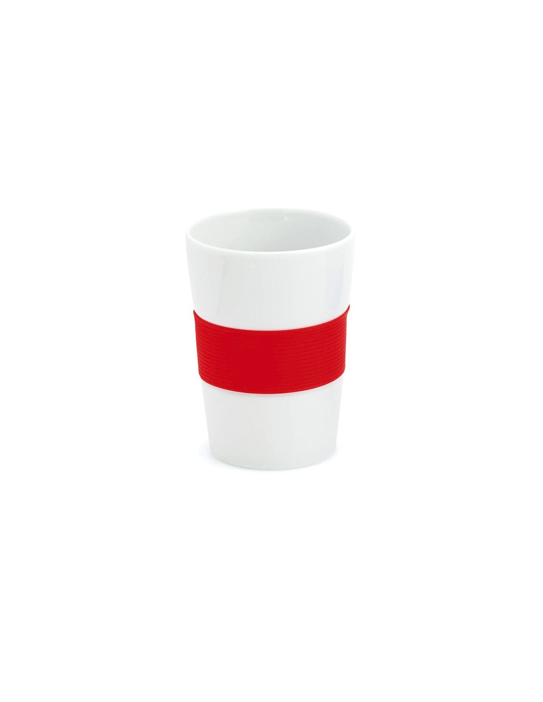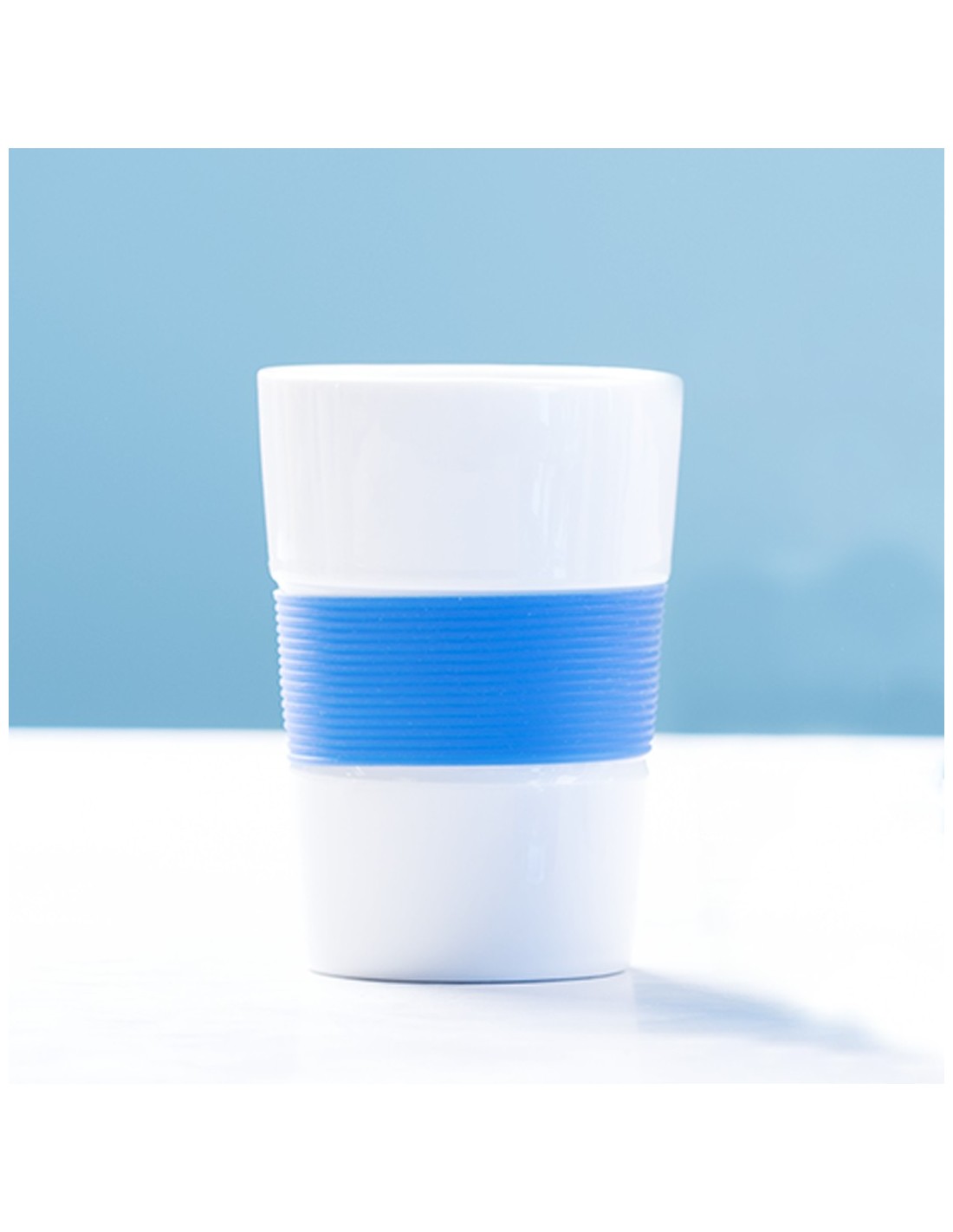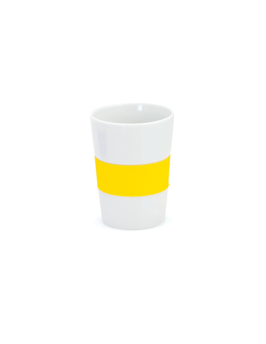 Vaso de cerámica de 350ml de capacidad en divertida combinación de exterior e interior en color blanco con tira de silicona antiquemaduras en divertida gama de vivos colores. Presentado en caja individual.