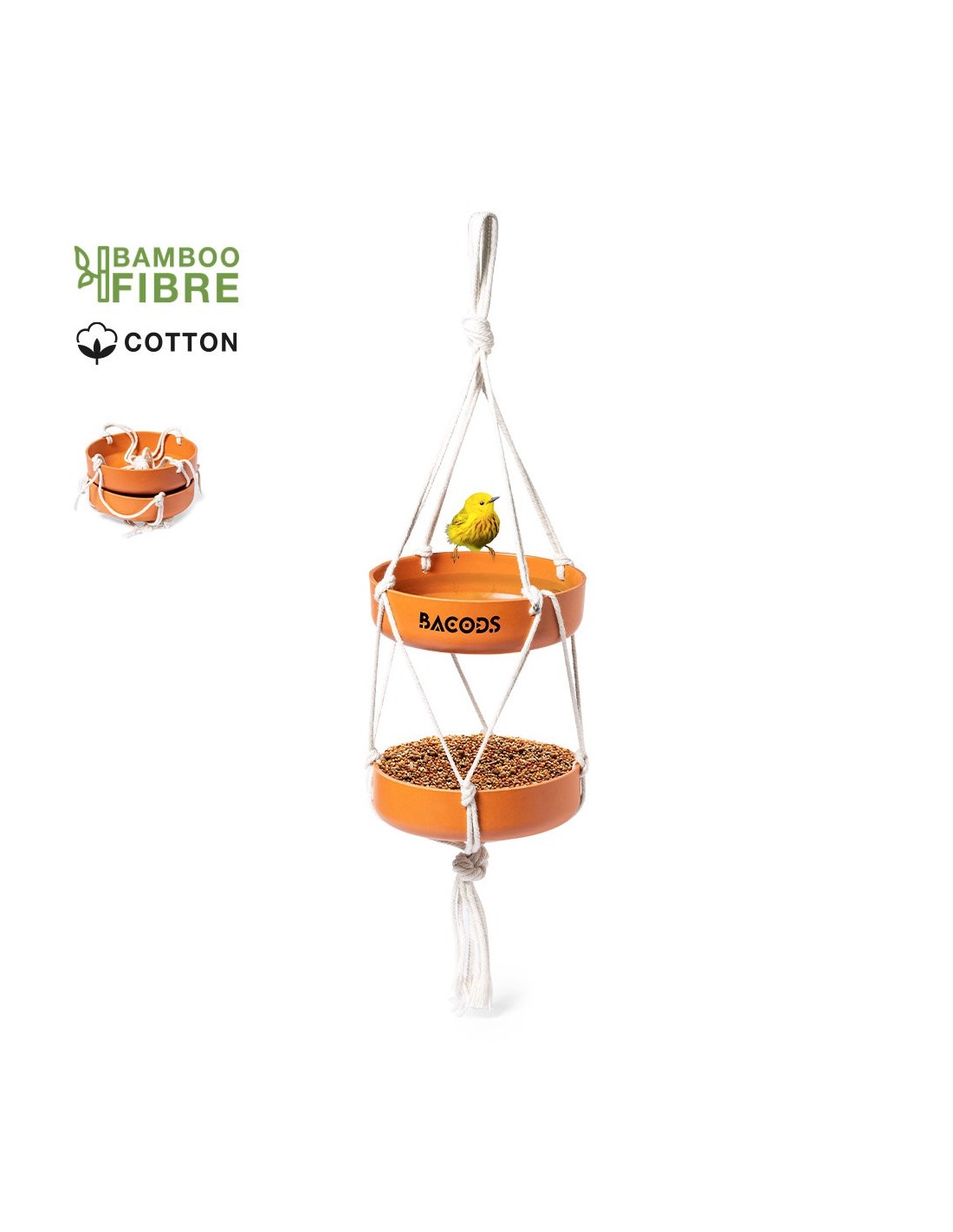 Comedero colgante para pájaro. Con dos recipientes fabricados en fibra de bambú (medidas 15 x 4 cm cada uno) y resistente cuerda de algodón natural. Presentación en caja individual de diseño kraft.