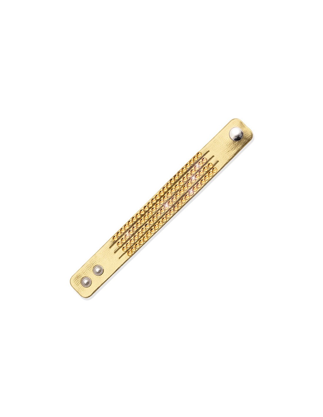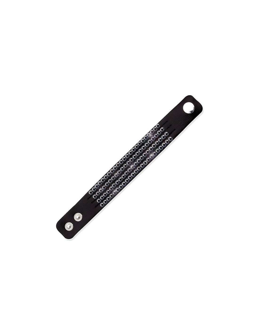 Elegante pulsera de polipiel con incrustaciones brillantea de vivos colores. Con cierre de corchete ajustable.