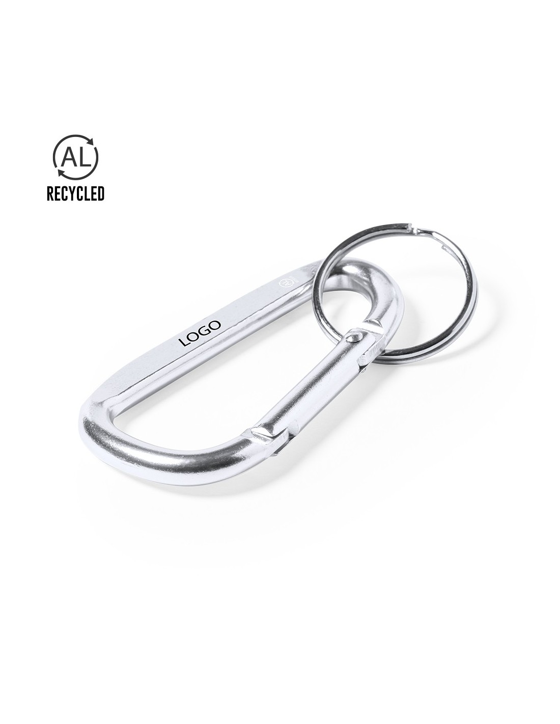 Mosquetón en aluminio reciclado de acabado plateado. Con anilla llavero metálica a juego y distintivo aluminio reciclado. El aluminio reciclado es un material con posibilidades de reciclaje casi infinitas, sin perder sus propiedades originales y consumiendo menos energía en este proceso.
