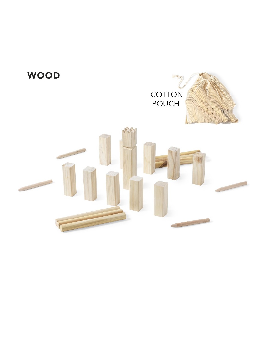 Juego ancestral de kubb fabricado en resistente madera natural de pino. Set de 21 piezas, en bolsa de transporte 100% algodón con cordón de cierre a juego. Presentación en caja individual de diseño kraft, con manual de instrucciones en español e inglés.