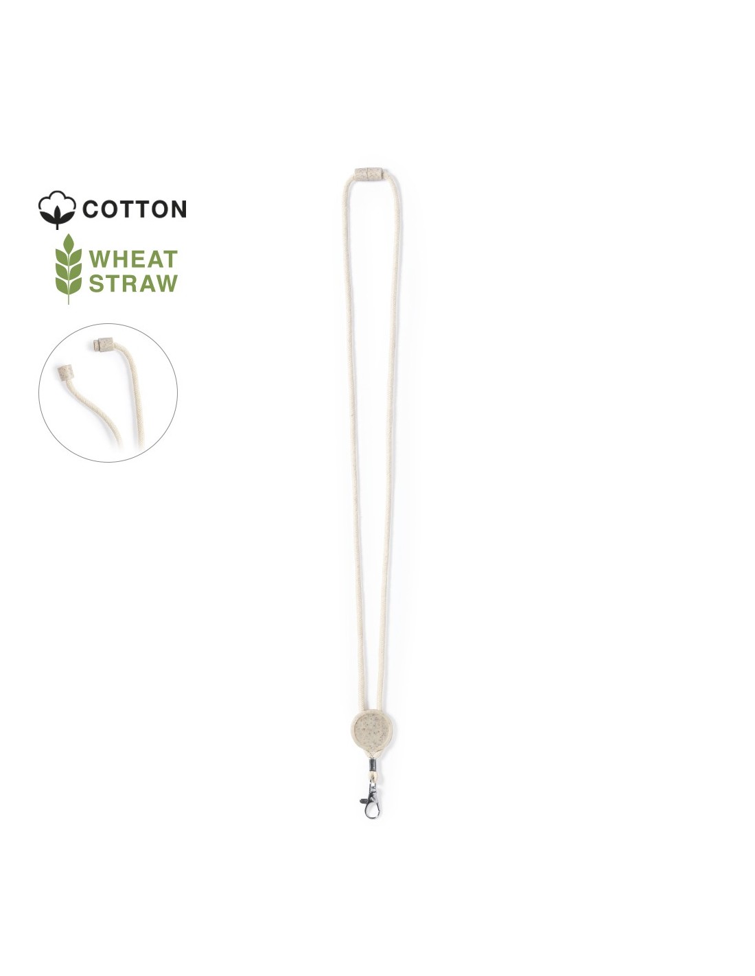 Lanyard de línea nature fabricado en resistente algodón 100%. Accesorio circular para personalización y cierre de seguridad en cuello fabricados en caña de trigo, con mosquetón metálico giratorio. La caña de trigo fomenta la utilización de materias primas naturales, reduciendo así las emisiones contaminantes.