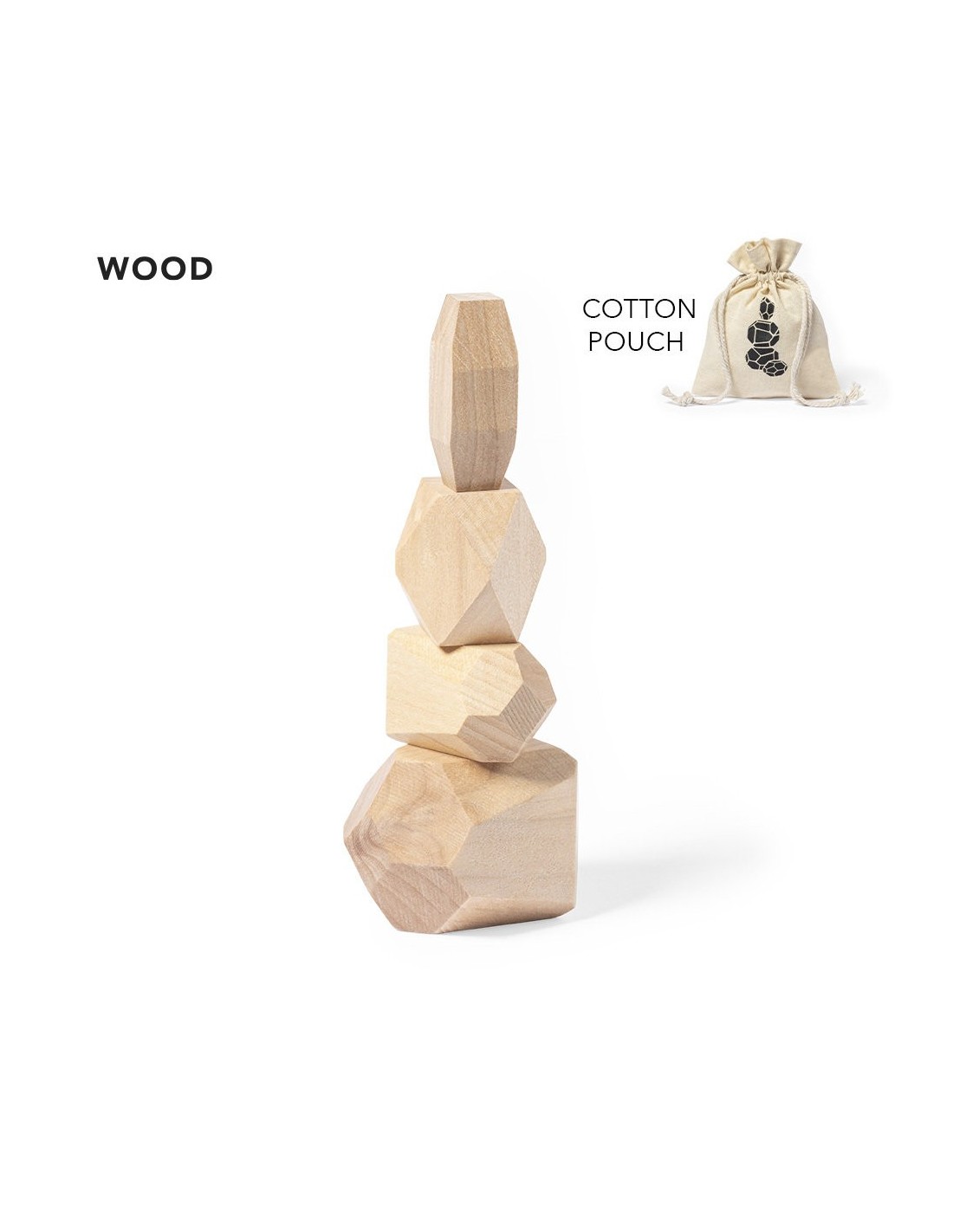 Juego de habilidad fabricado en resistente madera natural de pino. Set de 4 piezas de distintos tamaños, en bolsa de transporte 100% algodón con cordones de cierre a juego. Presentación en caja individual de diseño kraft.
