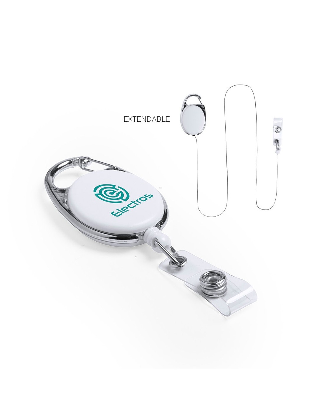 Porta acreditaciones extensible de sobrio diseño, con accesorio de cierre de botón para colgar la acreditación y con mecanismo extensible de hasta 75 cm. Con mosquetón de enganche metálico y amplia superficie de marcaje