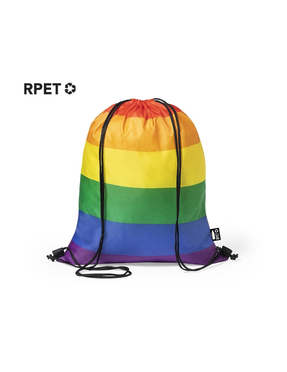 Mochila de cuerdas Rainbow multicolor, fabricada en RPET 210T. De acabado cosido y con cordones de cierre premium en negro. Todo un orgullo de mochila, con distintivo RPET en etiqueta exterior. El material RPET se elabora a partir de plástico reciclado, para así fomentar la reutilización de residuos plásticos y ayudar a la sostenibilidad del planeta.