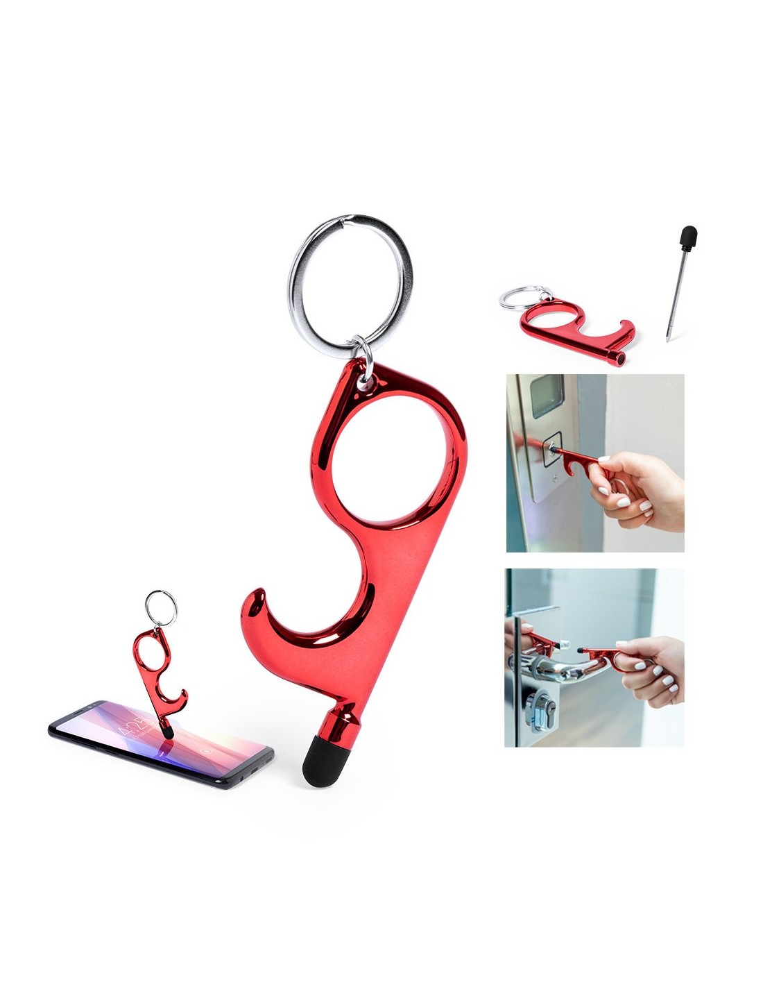 Llavero higiénico anti-contacto con bolígrafo y puntero integrados. Fabricado en resistente ABS de acabado metalizado y disponible en variada gama de colores. Especialmente diseñado para evitar tocar con las manos superficies de uso común (manivelas de puertas, interruptores, grifos de uso público, cajeros automáticos...). Con cómodo troquel para el dedo y presentado en bolsa individual de diseño. Recomendado para marcaje en tampografía.