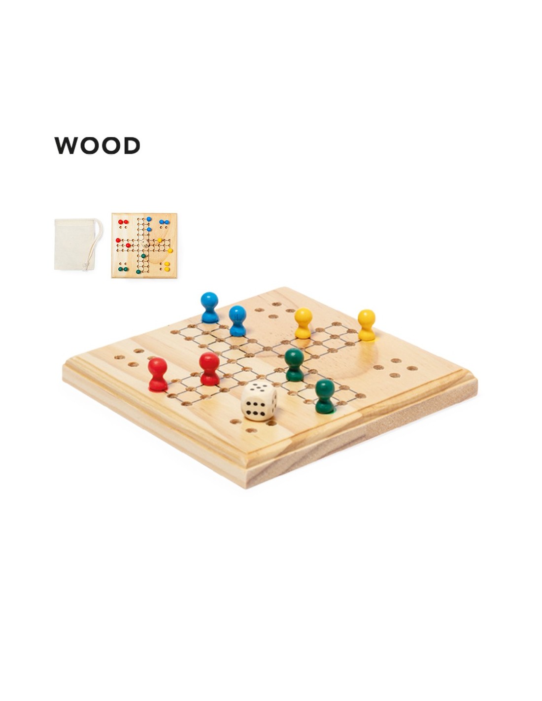 Entretenido juego de parchis fabricado en madera. Contiene un tablero, 16 fichas de 4 colores diferentes y un dado. Para participar entre 2 y 4 jugadores. Con práctica bolsita de algodón para guardar las fichas. Presentado individualmente en caja de diseño kraft.