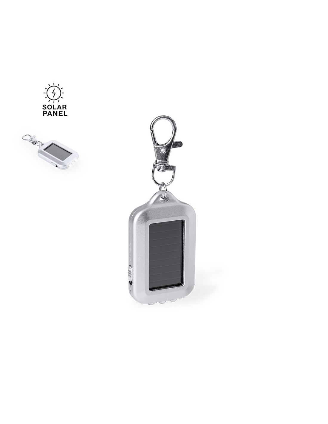 Práctico llavero linterna con carga solar, equipado con 3 luces LEDs y un botón lateral de encendido y apagado. Se recarga fácilmente gracias a su placa solar. Con gancho metálico giratorio para un cómodo transporte. Presentado en caja de diseño kraft.