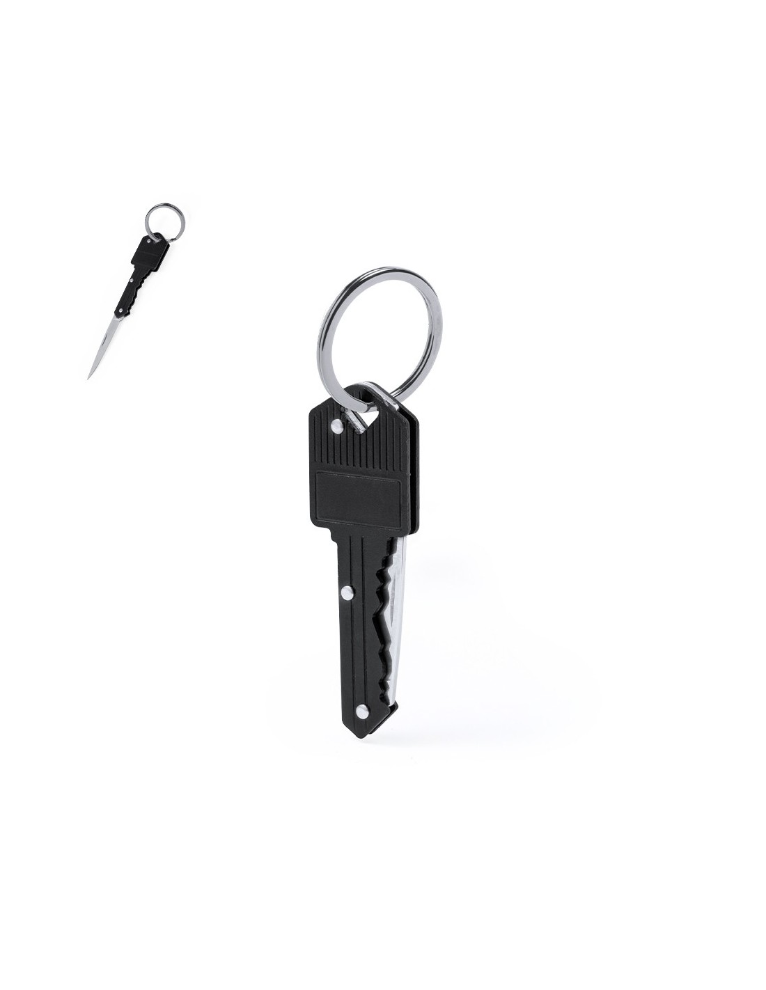 Distinguida navaja en forma de llave fabricada en aluminio y acero inox. Con anilla para llavero y hoja plegable. Presentada individualmente en caja kraft.