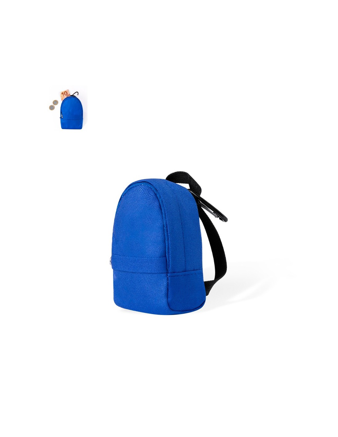 Original monedero en forma de mochila, con bolsillo de cierre de cremallera, cintas y con práctico mosquetón para poder enganchar fácilmente. Fabricado en resistente poliéster 600D y disponible en varios colores.