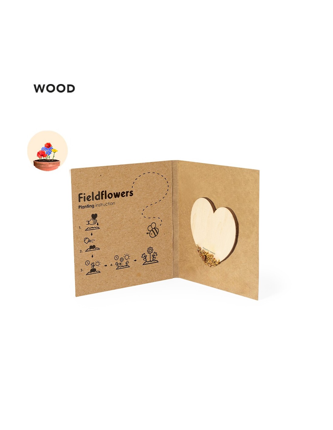 Corazón de semillas fabricado en madera natural, con semillas de flores silvestres listas para plantar y con una amplia superficie de marcaje en la cara posterior del corazón. Presentado en una elegante tarjeta de cartón reciclado, con instrucciones de plantado