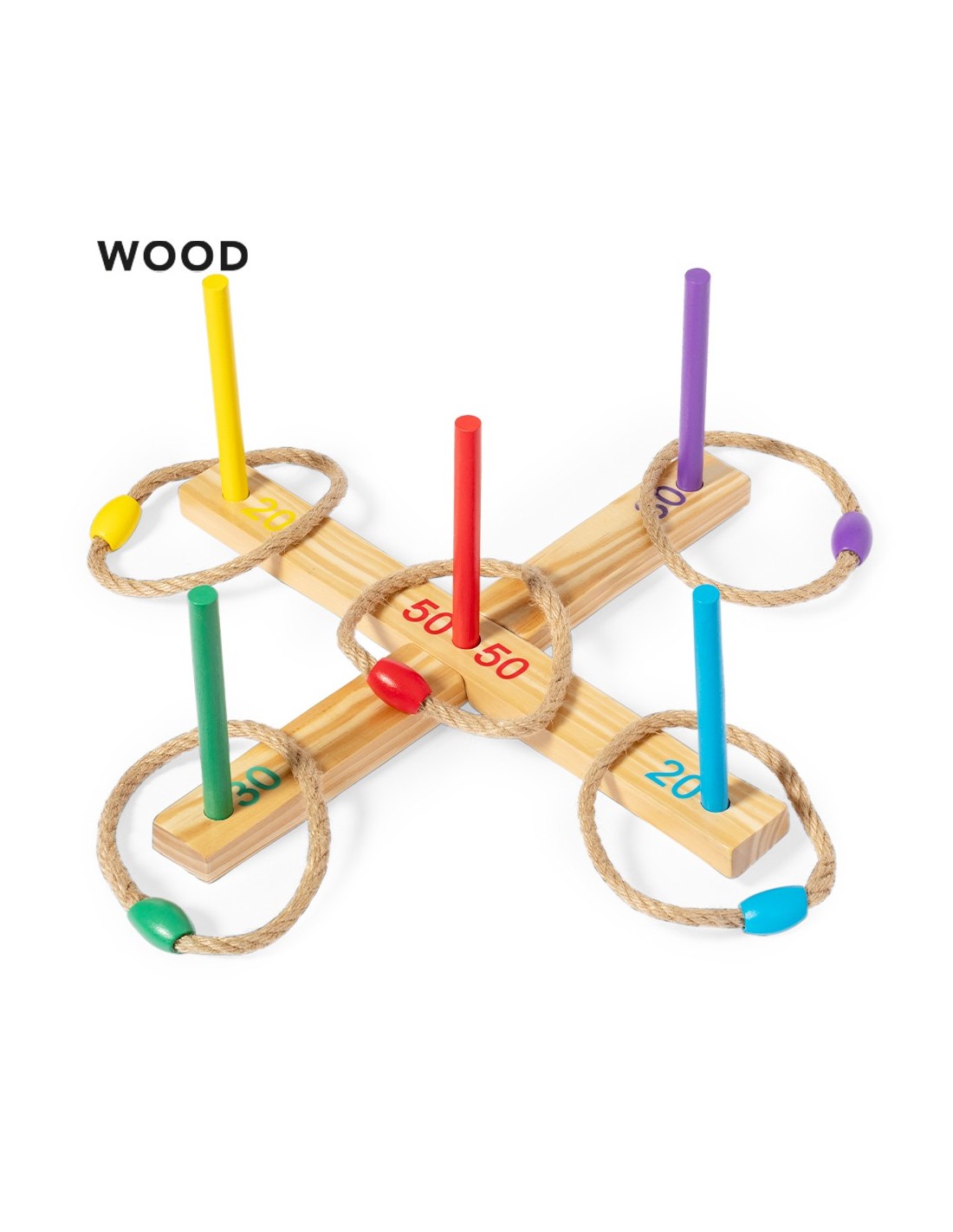 Juego de puntería fabricado en madera. Consiste en colar los aros de cuerda en la base con palos del mismo color (cada color tiene una puntuación diferente). Compacto y cómodo de montar, incluye 12 piezas. Con instrucciones en español e inglés. Presentado individualmente en una caja de diseño kraft.
