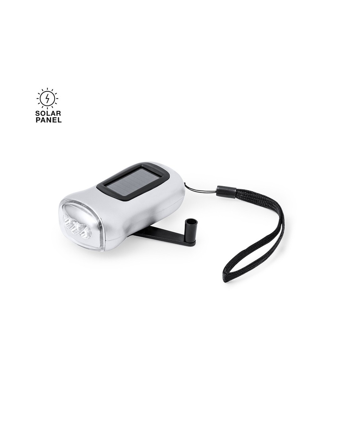 Linterna solar de mano, fabricada en resistente ABS. Su versatilidad con su doble función de carga: mediante la placa solar incorporada y de forma manual gracias a la dinamo integrada, ofreciendo una fuente de energía limpia y renovable reduciendo el consumo de pilas. Equipada con 3 potentes luces LEDs y un cordón que asegura un agarre firme para mayor comodidad. Presentada en caja de diseño kraft.