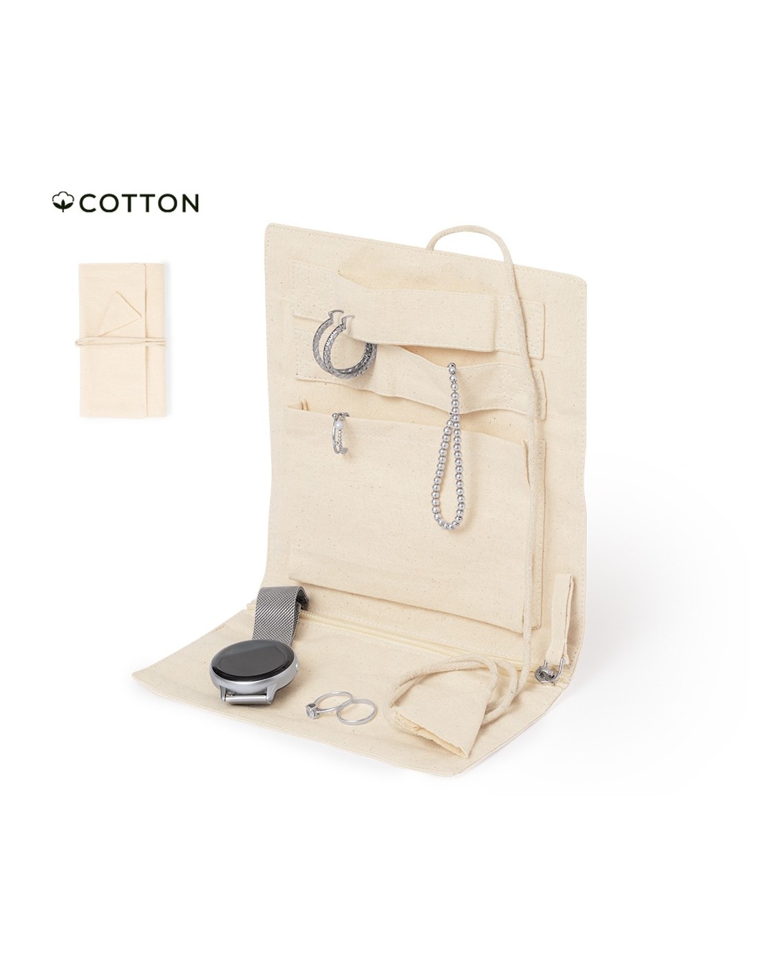 Joyero plegable fabricado en algodón, para guardar preciados artículos personales. Confeccionado en 3 partes de color natural: parte superior con cintas, parte central con bolsillo y parte inferior con bolsillo de cremallera, pudiendo plegarlo y sujetarlo firmemente con su cordón a juego.